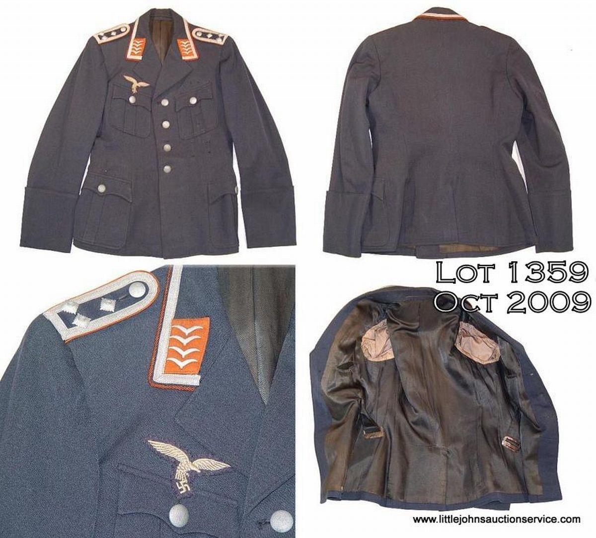 Luftwaffe M-35 Communications Stabsfeldwebel Service Tunic. The tunic is an approx. size 38 and is made of blue/grey wool/rayon blend material. It features a vertical, four button, front closure with small fold back lapels and a lay downcollar. It is complete with all of it's original pebble finished, alloy buttons. The tunic has four, pleated, patch, front pockets with button down scalloped flaps. The right breast features an early, machine woven "droop-tailed", styleLuftwaffe eagle, clutching a canted swastika in one talon, in light-gray cotton thread, mounted on a cut-out, blue/gray, wool background. The eagle is neatly handstitched to the tunic. The left breast features five sets of award loops. Thestraight cut, non-adjustable sleeves have deep, fold back, French cuffs which are tacked in the upright position at both the inner and outer sleeve seams. The reverse of the tunic has a central, vertical, tail skirt vent. The tunic hassewn-in style shoulder straps, which are made of blue/gray wool with bright, silver/aluminum, NCO's tress to all the outside edges, with three stamped, aluminum pips and light-brown wool waffenfarbe piping. The shoulder strap's retaining