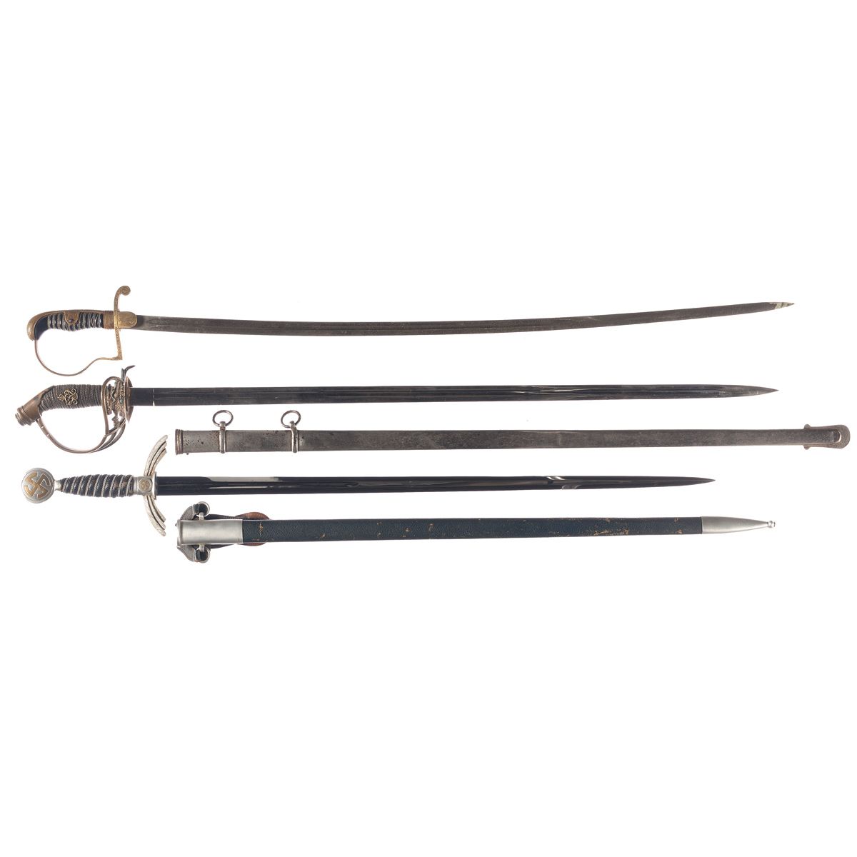 1) Nazi Officers saber, 34 1/4" single fuller blade, oak leaf and Nazi guard engraving, wire wrapped grip. Good. 2) Imperial German sword, 33" double fuller blade, folding guard, wire and rayskin grip, nickel scabbard. Good. 3) Helbig (Steinbach) Luftwaffe sword, 28 1/2" single fuller blade, blue leather grip, and scabbard with hanger. Some wear on the leather, otherwise very good.