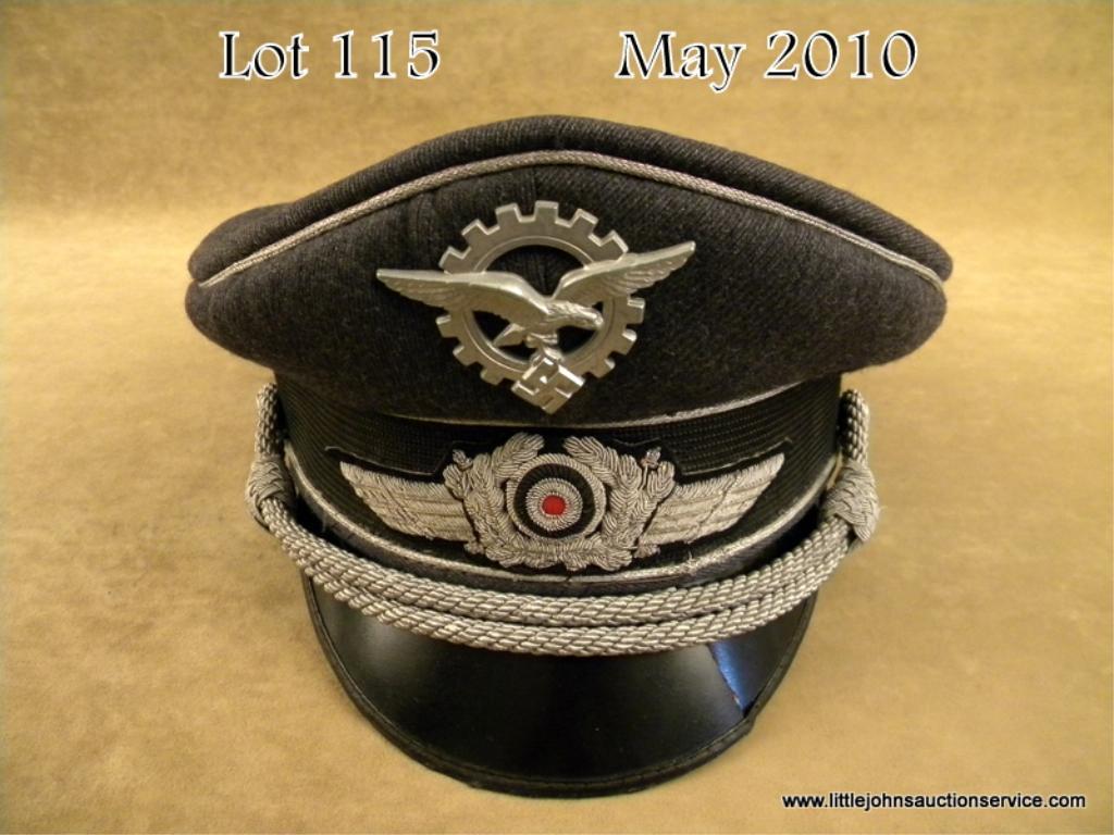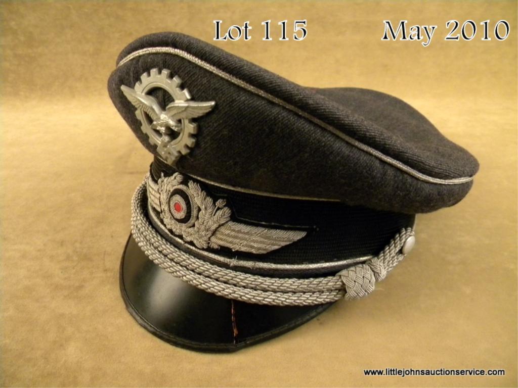 Luftwaffe Technical Officer's Visor Cap. The cap is an approx. size 57 and is made of blue/gray wool, with a black, ribbed mohair center band and silver/aluminum wire piping. The cap features hand embroidered, silver/aluminum wire wings,wreath and cockade, and a die struck Luftwaffe technical eagle and cogwheel cap insignia. The chin cords are made of silver/aluminum wire, and are held in place via two pebble finish aluminum side buttons, which are sewn to the sides of thecap. The visor is made of thin, black fiber with edge trim, and a green cross hatched underside, with a slight crack on the visor's left side. It is lined with golden silk lining, however the celluloid sweat shield is missing. The sweatbandis made of beige leather and is solid with some light edge wear. There is one small period repair to the top, right side of the cap. The overall condition is very good, with light to moderate wear from period use Est $600 - $1,200