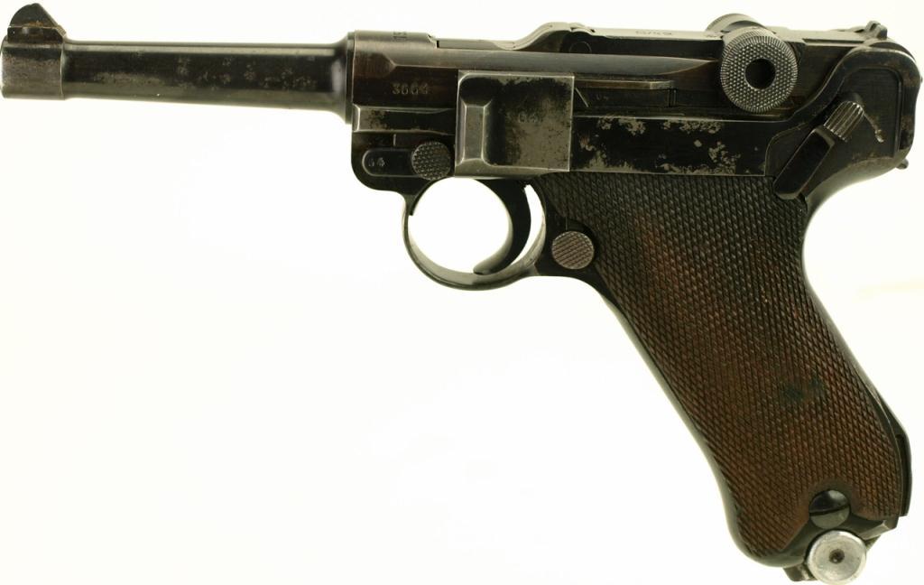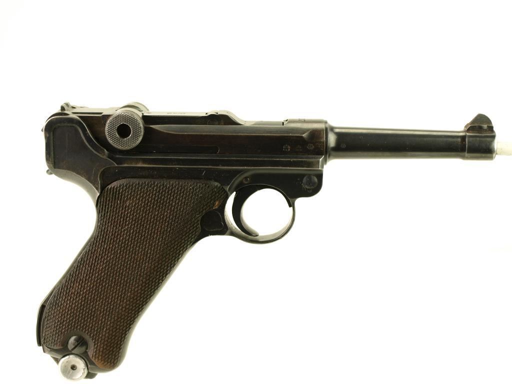 4" barrel, blue finish, good checkered walnut grips, German proof right side, barrel top dated "1937", toggle marked "S/42", all matching visible serial numbers except clip, left side barrel and frame show scattered pinprick pitting from poor storage, remainder good original blue. Includes original black leather holster and extra clip. FFL required.