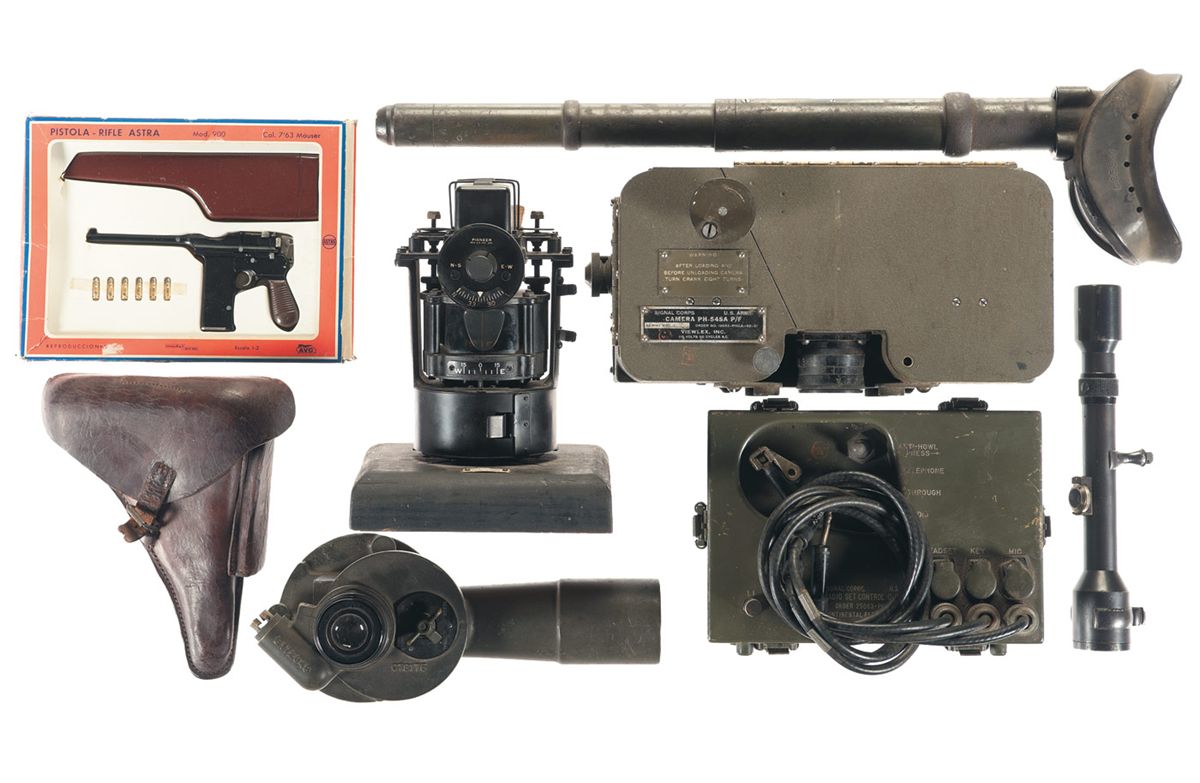 1 Pioneer Instrument 1829-2-A magnetic compass, 1 US Army Signal Corps radio set control C-1714/PG, 1 US Army Signal Corps camera PH-545A P/F, 1 Honeywell telescope elbow M17 and 1 M-51N Sherman tank sight. 1 unmarked Luger holster, 1 German Ajack 4x90 scope with claw rings and 1 miniature Astra Model 900 manufactured by AVC. Scope has a patch of oxidation and some areas of finish loss. Astra toy gun is very good and the box is fair. Holster is fair with part of the strap broken.