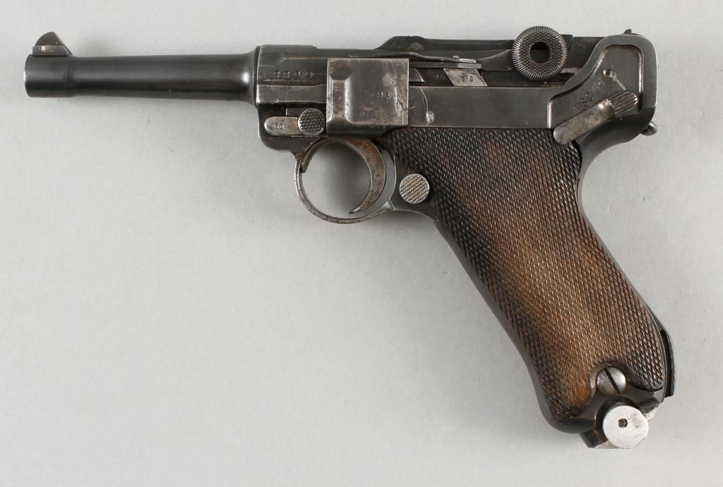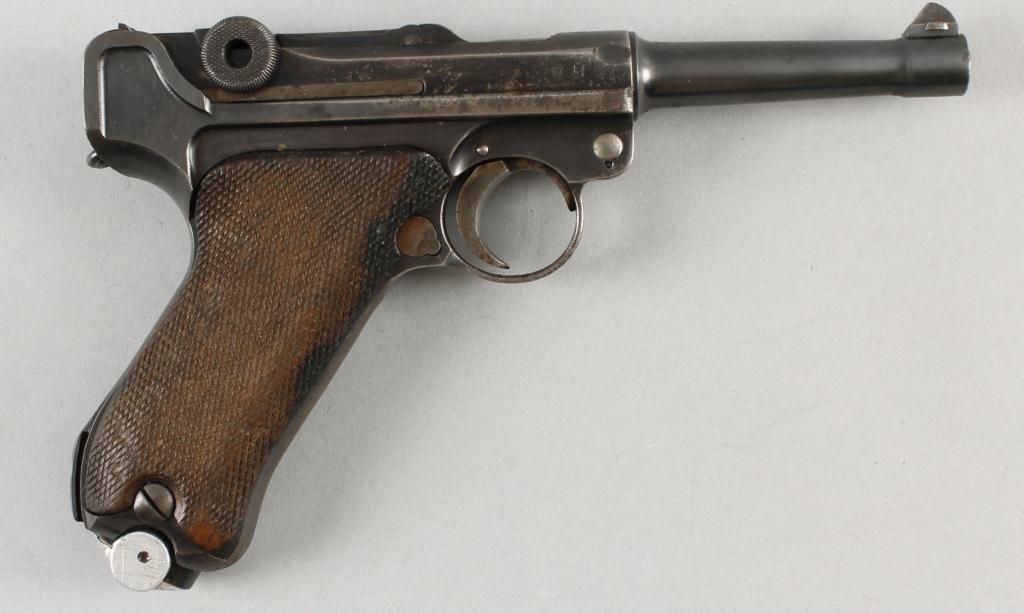 Luger Mdl DWM 1910 Cal 9mm SN:4460Single action semi-auto pistol, 4" barrel, blue finish with check
