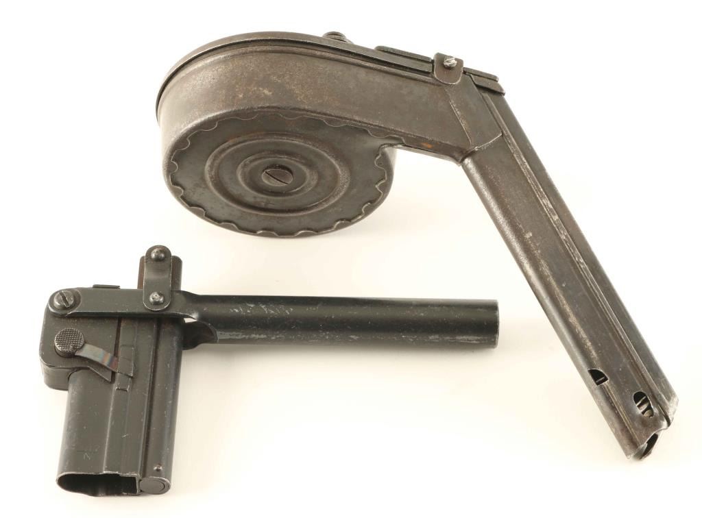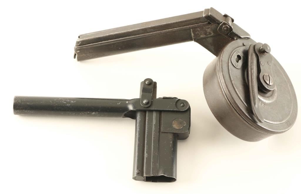 32 Round Magazine #293443(marked on the front and back) with loading tool, both are marked "B/N". The magazine displays an aged brown patina with scattered pitting and the loading tool has been painted black,