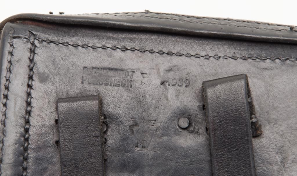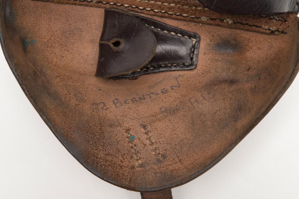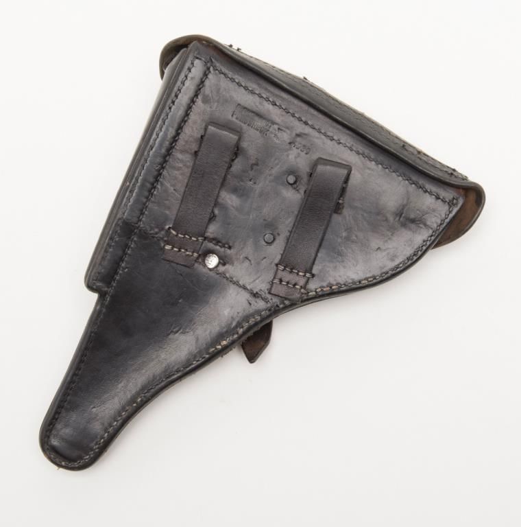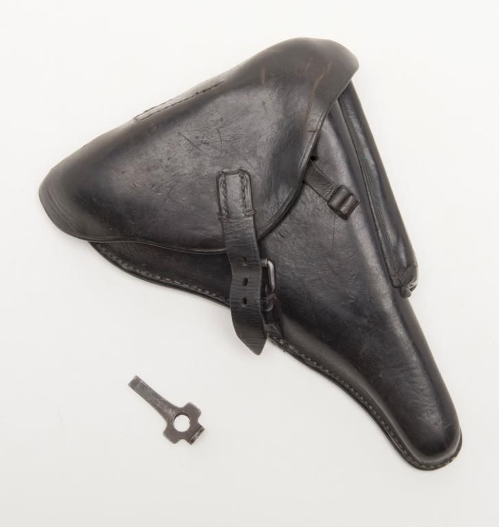Luger black leather flap holster, proofed and dated 1939, in overall very good condition with takedown tool and inked on inside of flap “Berntsen”. Est.: $100-$150.