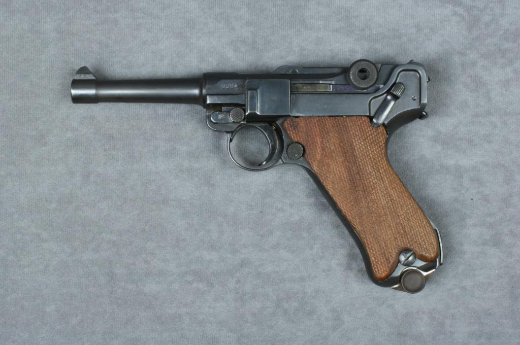 Luger by DWM semi-auto pistol, import marked, 9mm cal., 4” barrel, mat black re-finish, checkered wood grips, all matching visible numbers, #9584a. This gun is in overall very good condition as re-finished showing themajority of that mat black, very good bore, action and markings including “PwB.” Stamped on the front grip strap; very good grips, un-numbered wood base magazine. Est.: $350-$700.