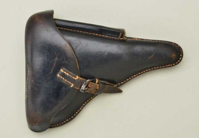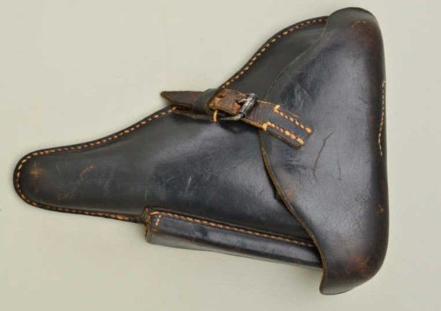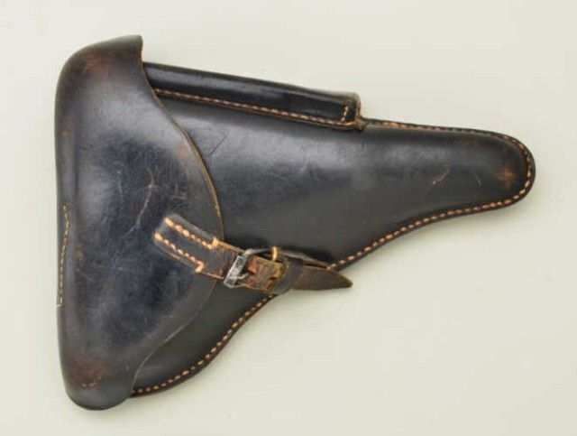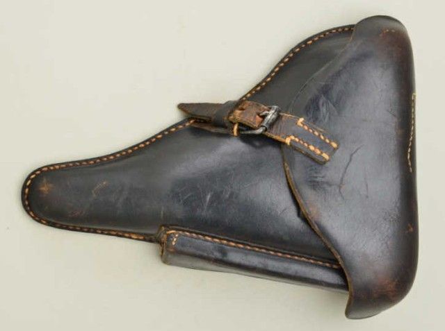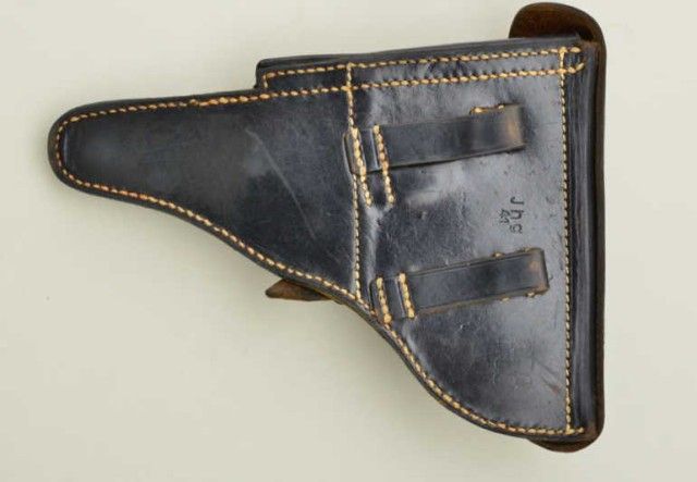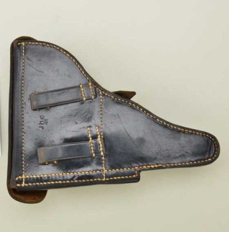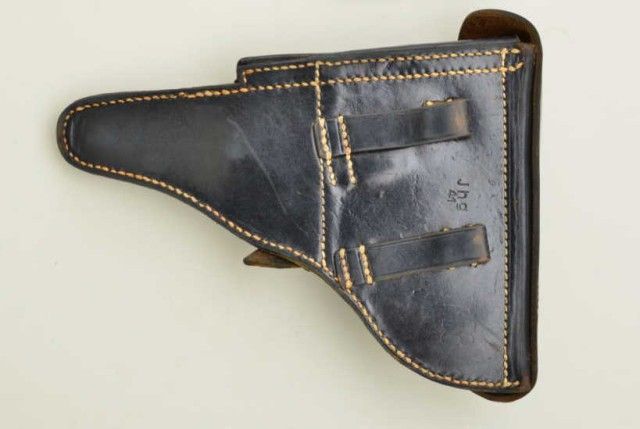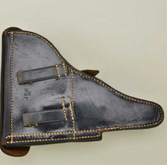 Luger holster marked “jhg-41 and P.O8” on reverse collectors tag reads “BYF 41 Black Widow” obviously separated from the gun. The holster is in very good plus near fine condition showing all original tabs andloops, some normal aging, the interior shows a stamped in ink Nazi acceptance mark with 1941 date. Est.; $250-$500.