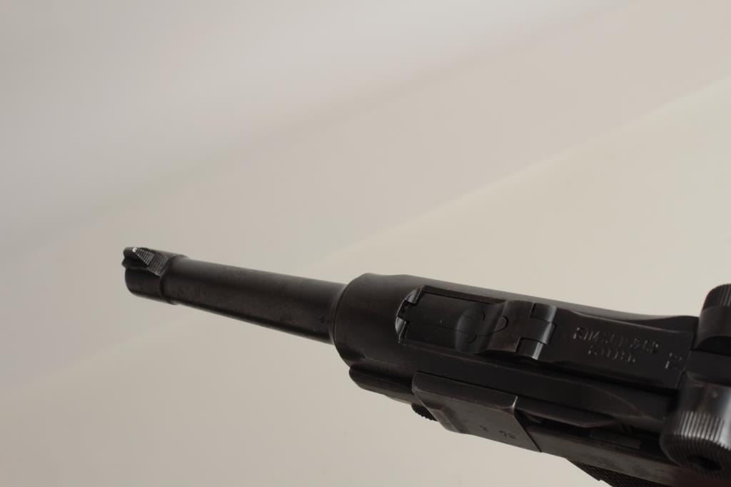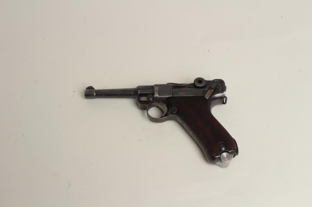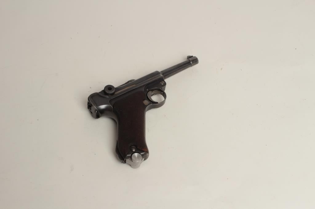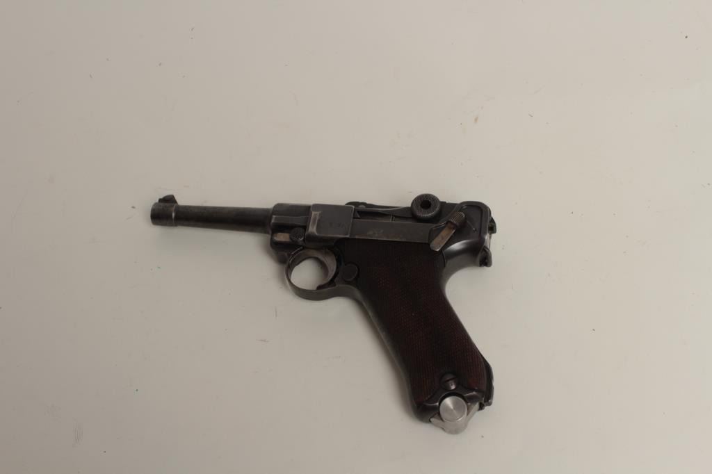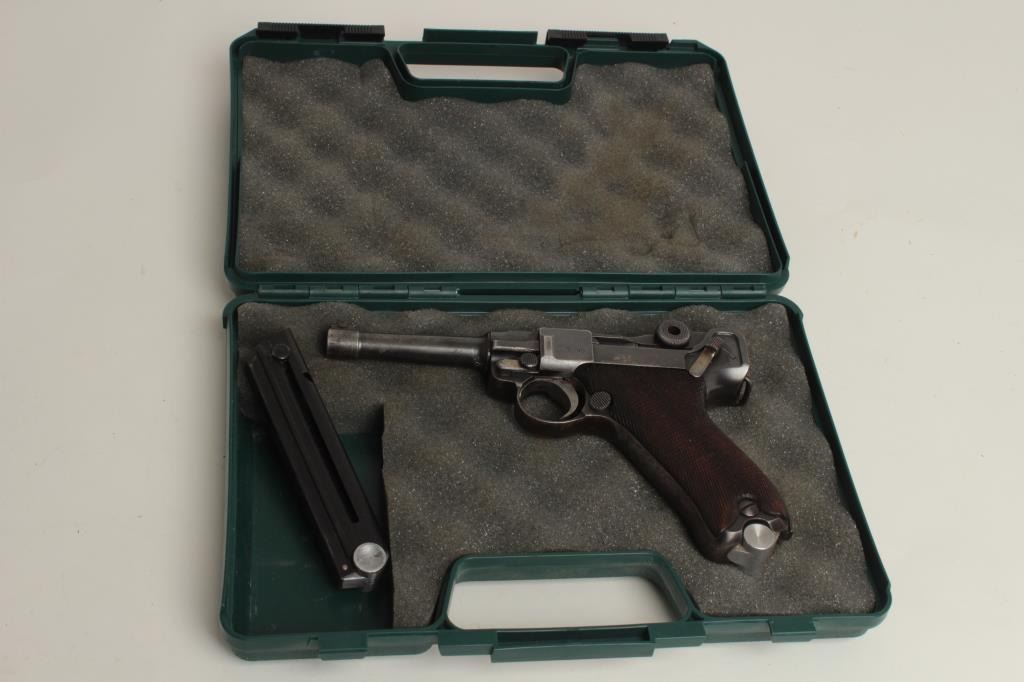 the Weimar Republic era and used in the early nazi period by Police and Military; matching visible numbers except magazine, 9mm caliber, 4” barrel, military finish with straw finish to small parts; overall good to very good condition with considerable blue finish, some scattered pitting on barrel and straps, very good + bore, crisp action and sharp markings; with extra magazine marked “made in Denmark”. Accompanied by a green hard carry case. (C&R/PPT). Est.: $900-$1,800.