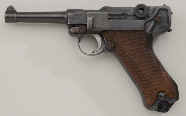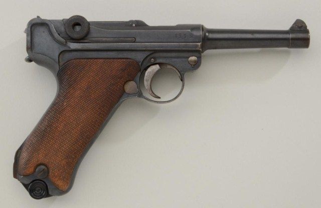Luger semi-auto pistol by DWM dated 1916 with German military proofs, 9mm cal., #5595; matching visible numbers; clip a later replacement; 80-90% blue aging and toning natural; grips good, bore good, good overall. Est.: $700-$1,400.