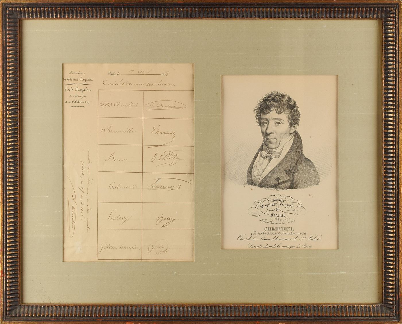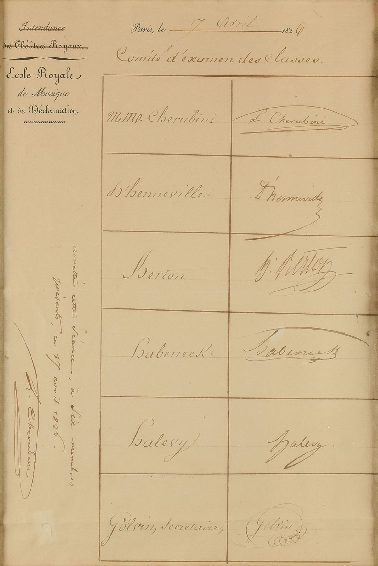 Italian composer (1760-1842) known for his operas and sacred music; Beethoven regarded him as the greatest of his contemporaries. Manuscript DS, in French, signed “L. Cherubini,” one page, 7.75 x 11.75, April 17, 1826. Document from the Paris Conservatory, signed by composer Luigi Cherubini (once in the top box, and also endorsed vertically in the left margin), violinist and conductor Francois Habeneck, composer and teacher Henri-Montan Berton, composer Fromental Halevy, and administrator Jean-Baptiste-Roger Fauchon d'Henneville. Matted and framed with a portrait of Cherubini to an overall size of 23.5 x 19. In very good to fine condition, with two folds, some light creasing, and a small repaired tear to the bottom. Cherubini served as director of the Paris Conservatory from April 1822 through February 1842, maintaining high standards and a well-regarded faculty.