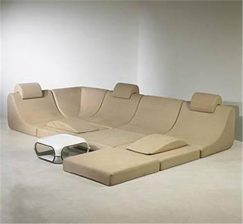 Luigi Colani<BR>modular seating units<BR>Rosenthal Studio-Line<BR>Germany, c. 1970<BR>upholstery over foam, rubber, plastic<BR>127.5"w x 100"d x 29"h<BR>An inventive designer, Colani has worked on projects ranging from cars to furniture. Here he creatively reconfigures traditional seating with this unique arrangement. Includes side table, three adjustable headrests, two adjustable leg rests, and nine seating components.<BR>Literature: Contemporary Furniture, Sembach, pg. 144<BR><BR><BR><BR>