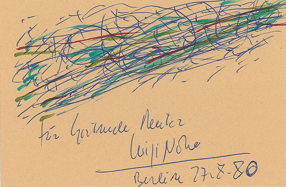 Important Italian composer (1924–1990) of adventurous tendencies, best known for his works in an advanced “serial” idiom and for his creative use of electronic resources. Original signed and inscribed sketch of an abstract image in felt tip and ballpoint on an off-white 6 x 4 sheet, signed and inscribed at the bottom in blue ballpoint, “For Gertrude Neilcz, Luigi Nono, Berlin, 77.8.80.” In fine condition.