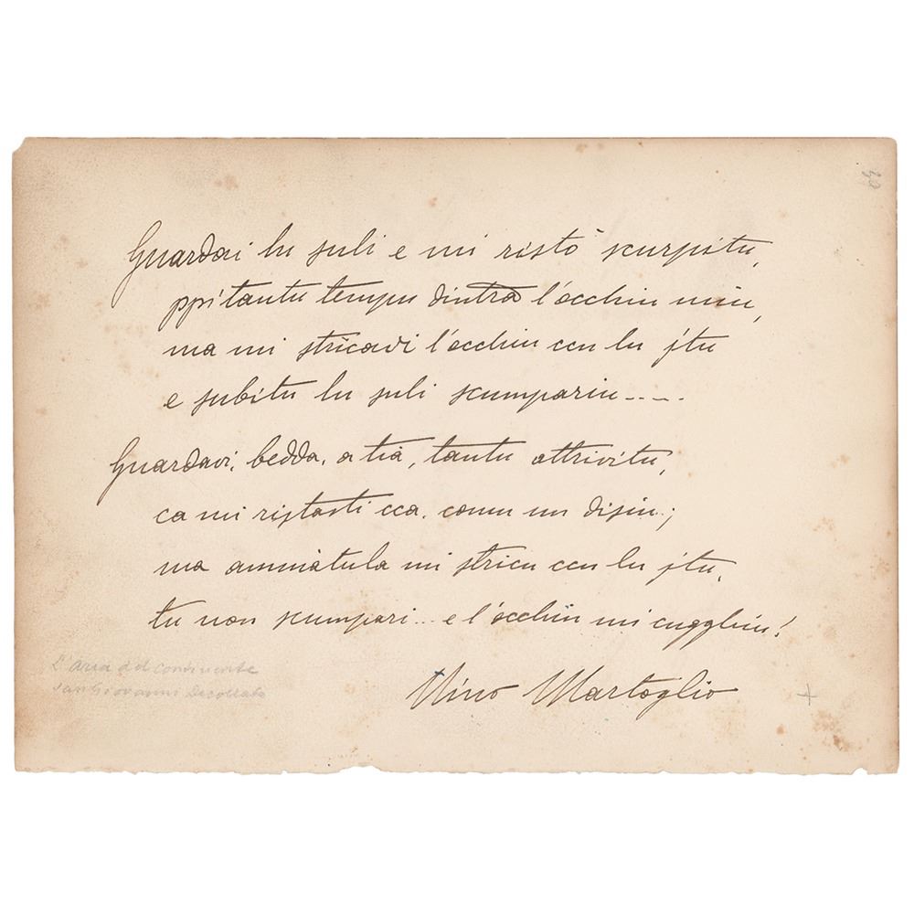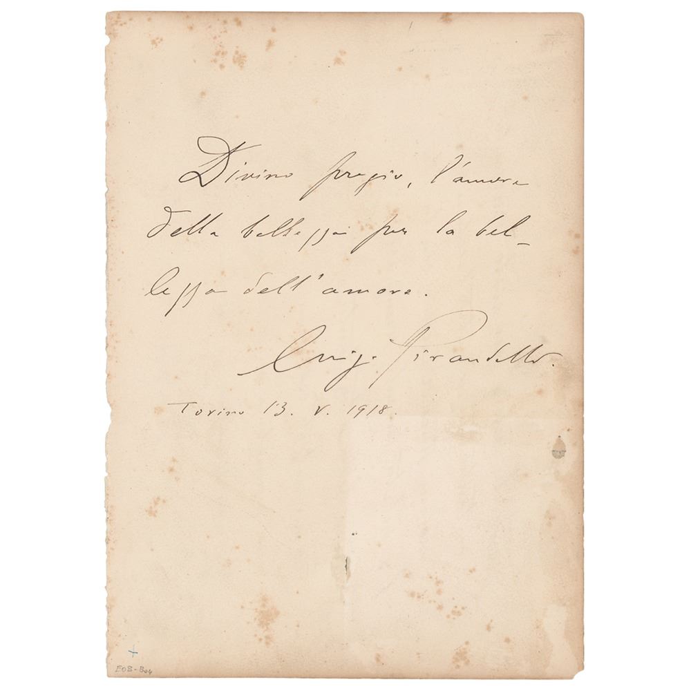 AQS in Italian, one page, 7 x 10, May 13, 1918. Pirandello pens a line about love. In very good condition, with scattered staining and toning.