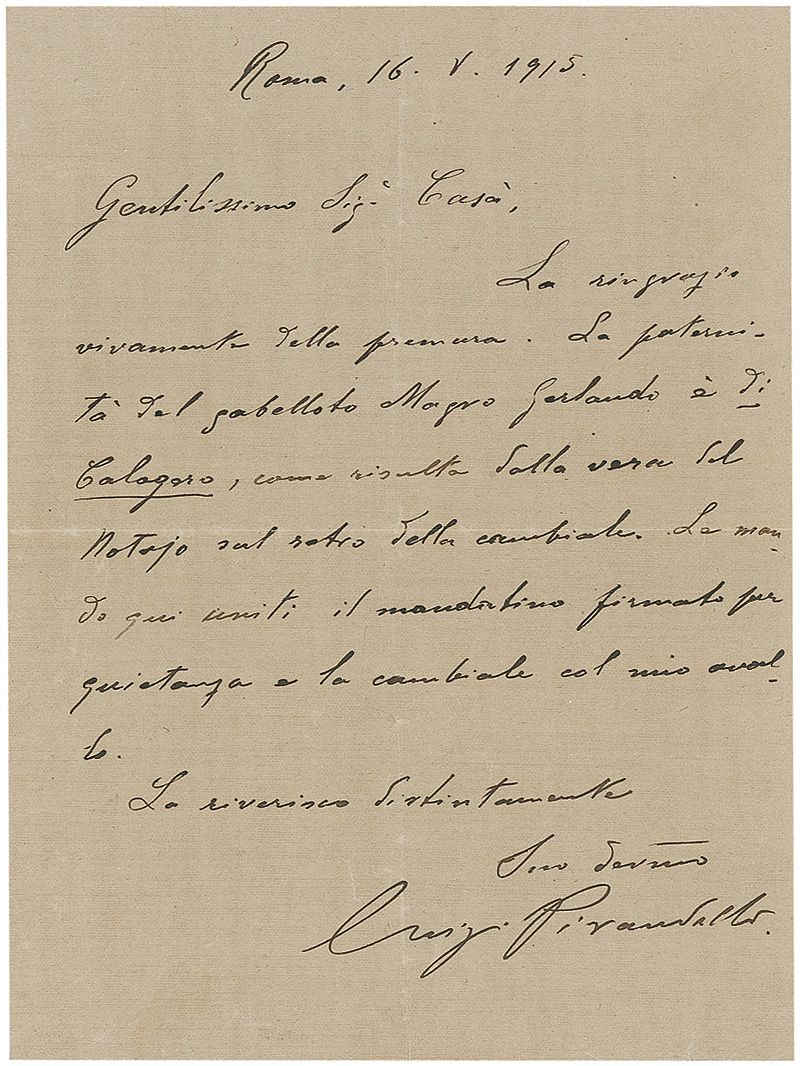 Italian dramatist, novelist, and short story writer (1867–1936) awarded the Nobel Prize in Literature in 1934. ALS in Italian, one page, 5.25 x 7, May 16, 1915. Letter to a gentleman on payments owed to a person whose paternity has just been identified. Central horizontal and vertical fold, with vertical fold passing through a single letter of signature, a few creases, one lightly through end of signature, and a uniform shade of toning, otherwise fine condition.
