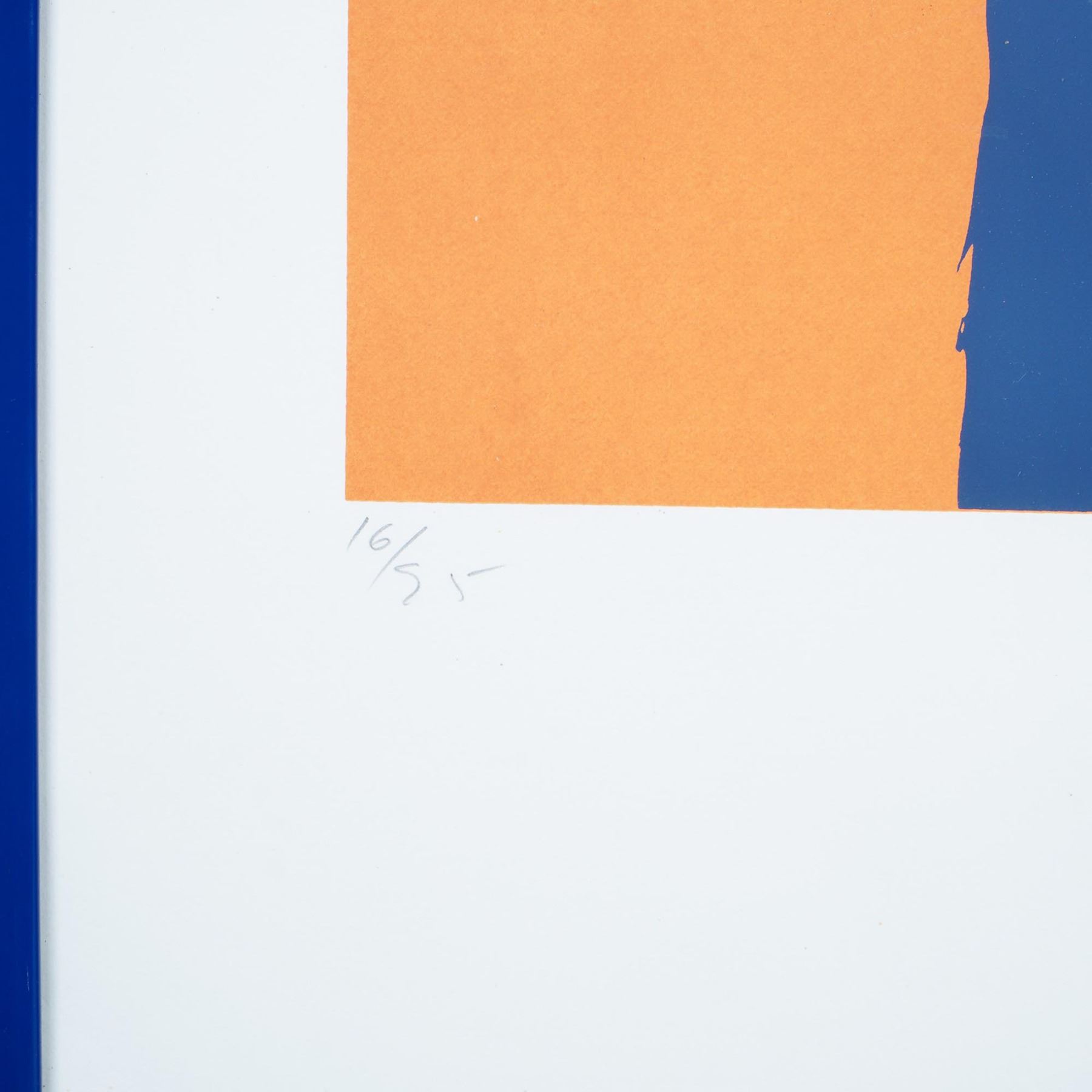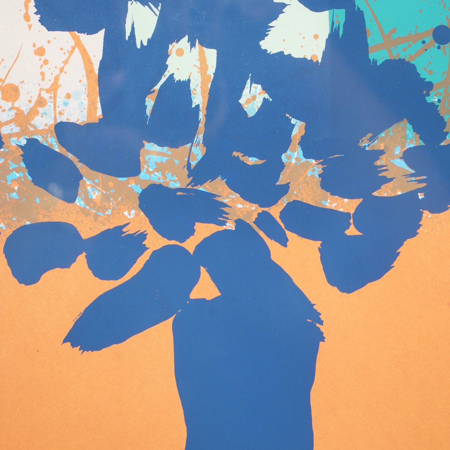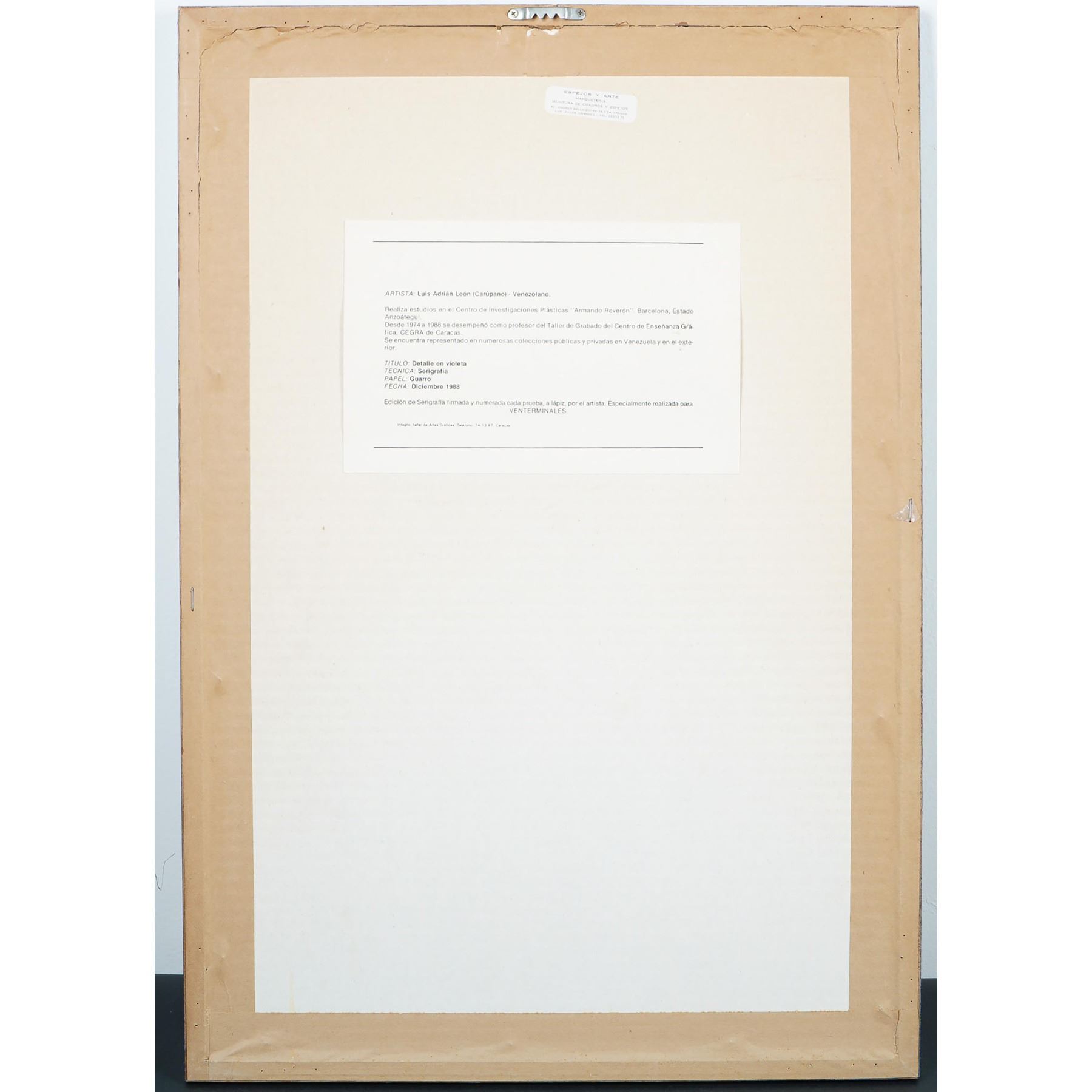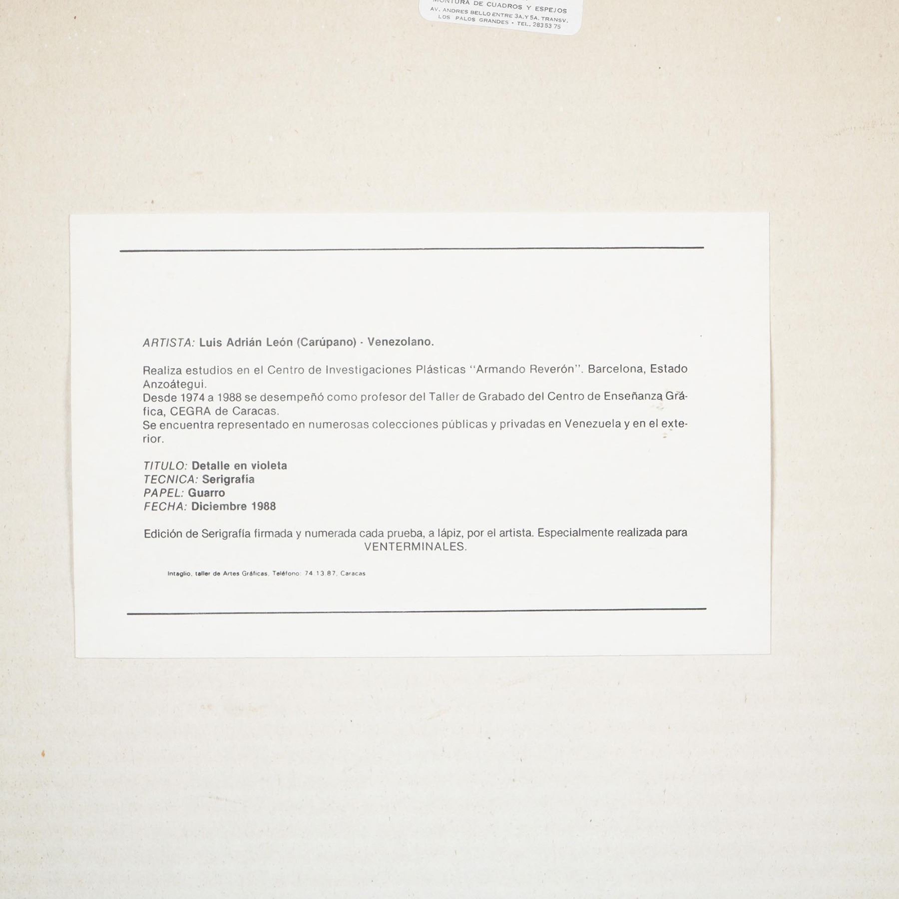 Colorful and dynamic limited edition serigraph on paper titled Details in Violet (Detalle en Violeta) by Venezuelan artist Luis Adrian Leon. Created in December 1988 on Guarro paper, this bold abstract work showcases Leon's distinctive graphic style, combining energetic brushstrokes and vibrant color blocks in orange, blue, and teal tones. Hand-signed and numbered 16/95 in pencil by the artist. According to the verso label, this piece was part of a special edition created for Venterminales and printed in Caracas. Leon is noted for his contributions to graphic arts education in Venezuela and has exhibited in both public and private collections nationally and internationally.