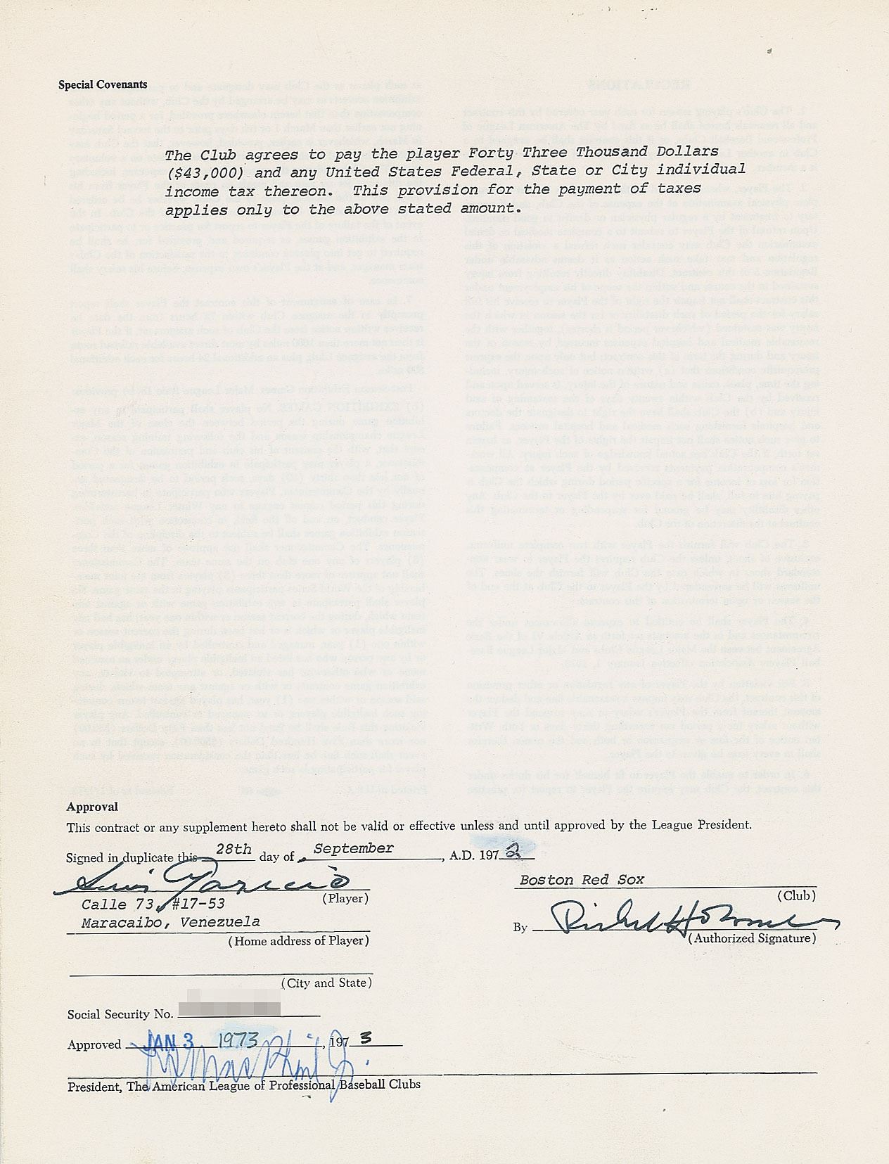 Contract, six pages on three adjoining sheets, 8.5 x 11, September 28, 1972. American League uniform player’s contract in which Luis Aparicio agrees to render “skilled services as a baseball player during the year 1972,” for the Boston Red Sox, for a salary of $43,000. Signed at the conclusion in black ink by Aparicio and countersigned by Red Sox General Manager Dick O'Connell and American League President Lee MacPhail. The special covenant section notes that the team will pay Aparicio $43,000 “and any United States Federal, State or City individual income tax thereon.” In fine condition.