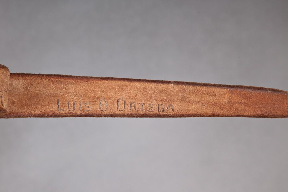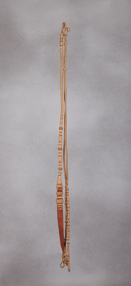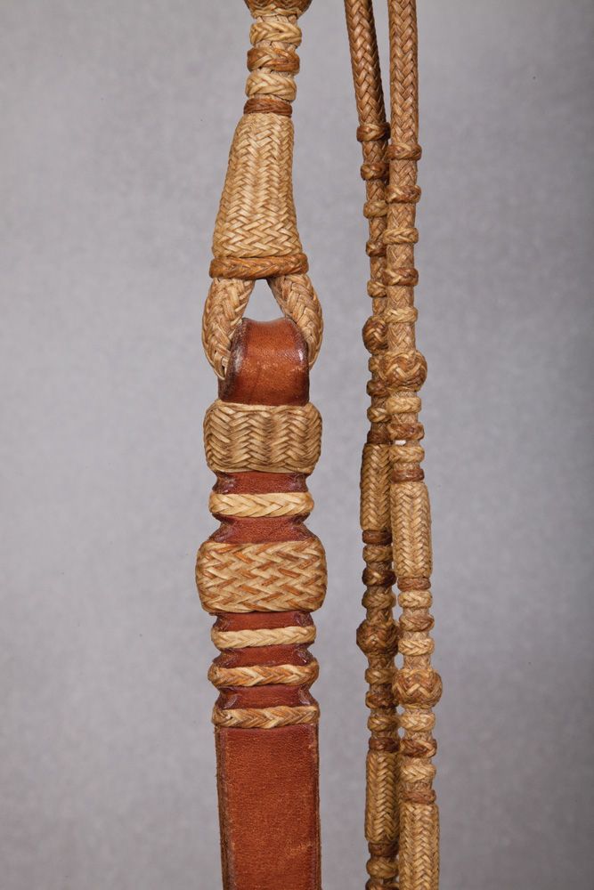 Signed (carved) LUIS B. ORTEGA inside the leather popper, these fancy two-tone braided rawhide show reins are 1/4” wide with a half-inch romal. Both reins and romal adorned with natural and tea-stained, round buttons. Spanish knot design on the popper with alternating tea-stained interweaves. Excellent condition.