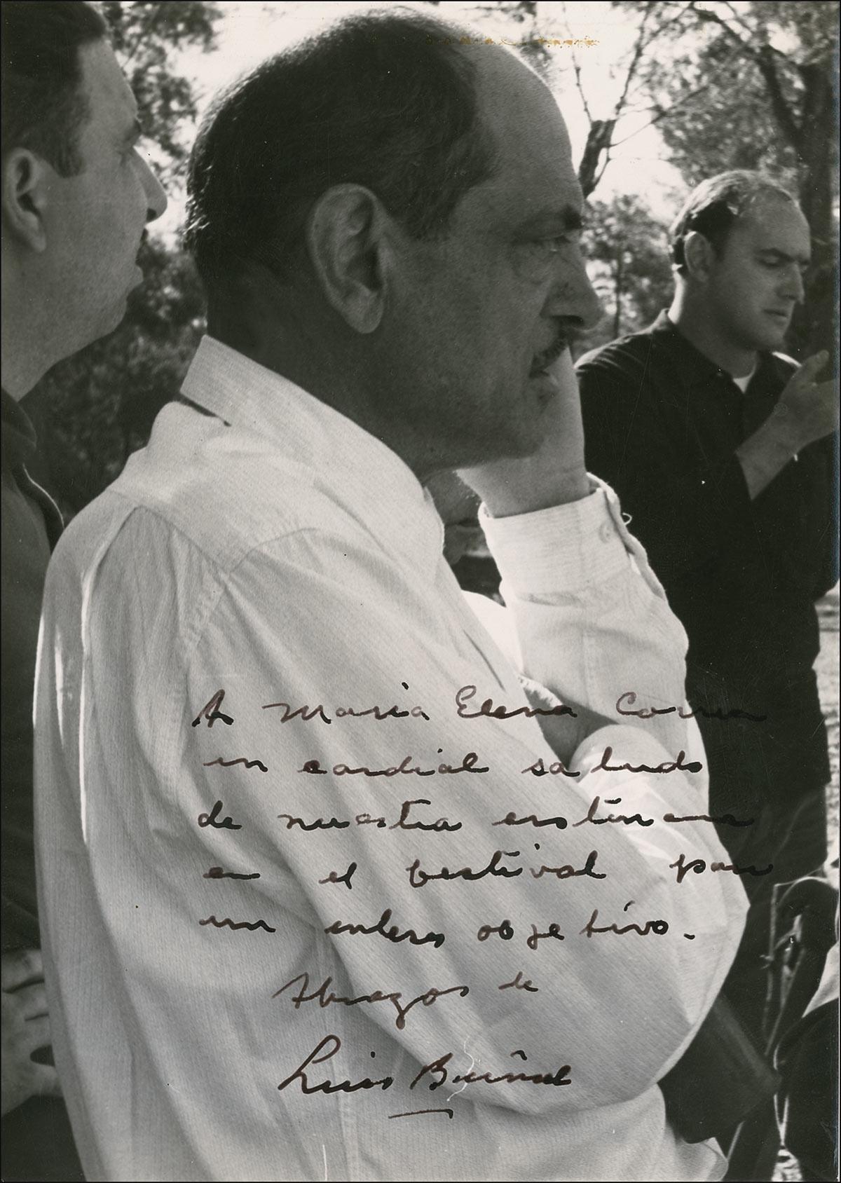 Highly influential Spanish-born filmmaker of surrealist tendencies whose Un chien andalou (1928) remains an icon of avant-garde cinema. Though he remained controversial for the duration of his career, he attained a measure of Hollywood respectability with Academy Award nominations for his screenplays for The Discreet Charm of the Bourgeoisie (1972) and That Obscure Object of Desire (1977). Vintage glossy 5 x 7.25 photo of Bunuel on the set, signed and inscribed in fountain pen in Spanish. Reverse of photo bears a large promotional stamp for Bunuel’s 1961 film Viridiana. Scattered light surface marks and spots, lightly trimmed edges, and small spot of adhesive remnant near top, otherwise fine condition. Pre-certified PSA/DNA and RRAuction COA.