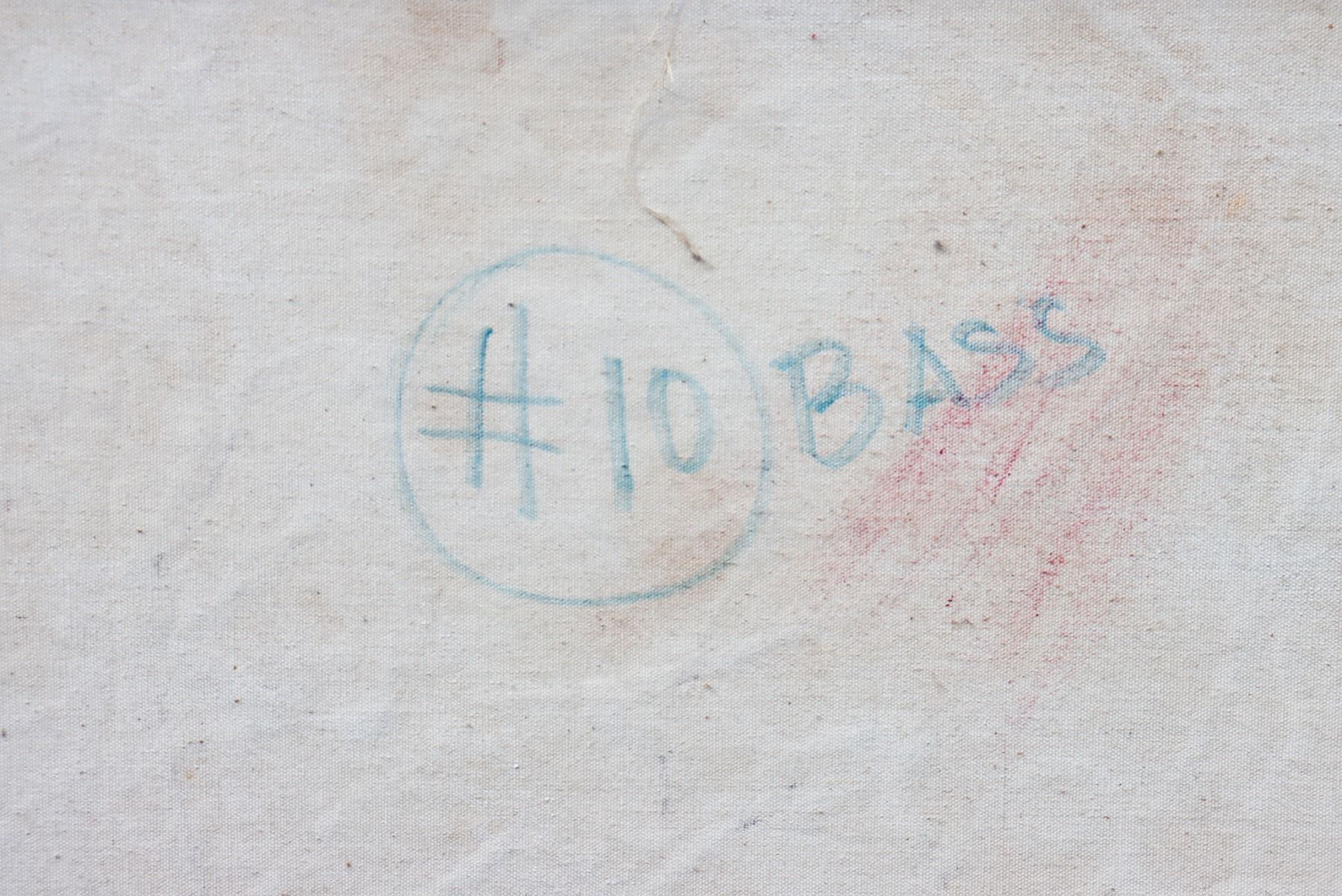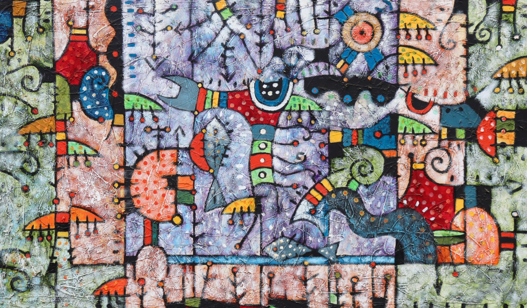 "Obi...Obi, Obilase, Obi, Obi La Na", is a colorful texturized acrylic on canvas, abstracted imagery somewhat reminiscent of the work of Paul Klee.