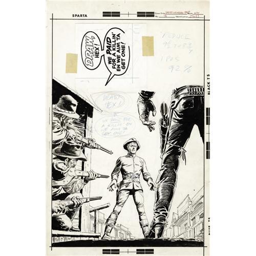 <B>Luis Dominguez - Weird Western Tales #31 Jonah Hex Cover Original Art (DC, 1975).</B></I> The odds are really stacked against Jonah Hex in this supremely suspenseful cover hook. Luis Dominguez's finely detailed and dramatic art rivals that of other DC cover greats such as Nick Cardy, Joe Kubert, and Russ Heath. The image area of this showdown measures approximately 9.75" x 15", and aside from missing its DC logo stats (which could be easily replaced), the art is in Very Good condition.<BR><BR><b>Shipping:</b> Small Flat (<a target="_blank" href="http://www.heritageauctions.com/common/shipping.php">view shipping information</a>)