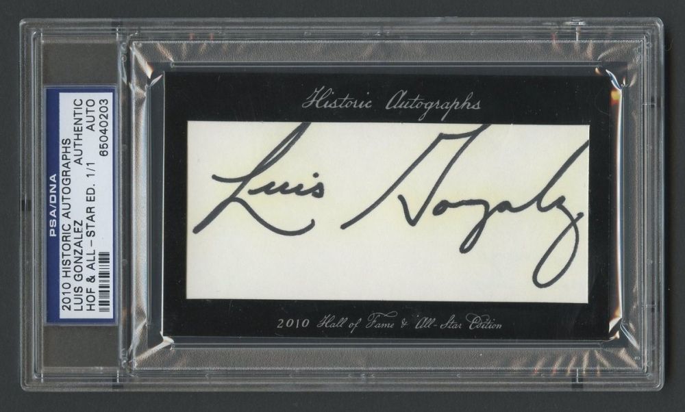 Hand-signed in black felt-tip pen by Luis Gonzalez (Diamondbacks). Autograph is authenticated and encapsulated by PSA/DNA for authenticity purposes.