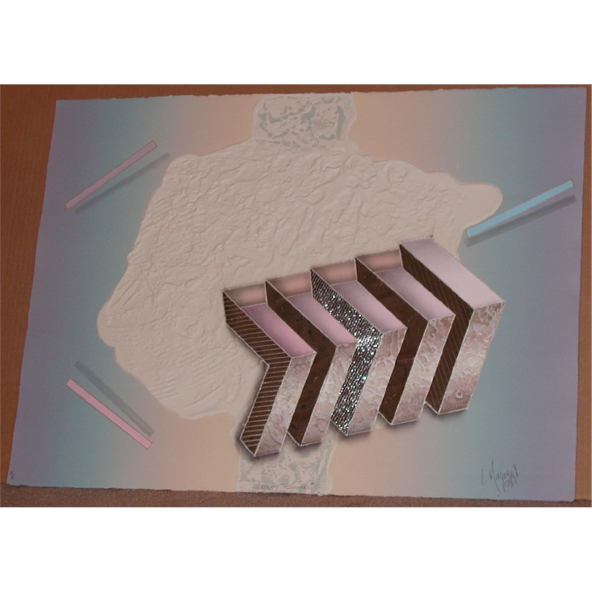 Original etching with embossing and collage 22”x30”. Signed in pencil by the Mexican artist and numbered in an edition of 125 with 12 artists proofs. Printed at the Soho Graphics Workshop, circa 1987. A beautiful example of the deep textural embossing and unusual collage effects in Mazorra's etchings along with his unique space illusions. Detail photos show the deep embossing that Mazorra achieves on all his etchings. Domestic shipping and packing-$65, International depending upon location.