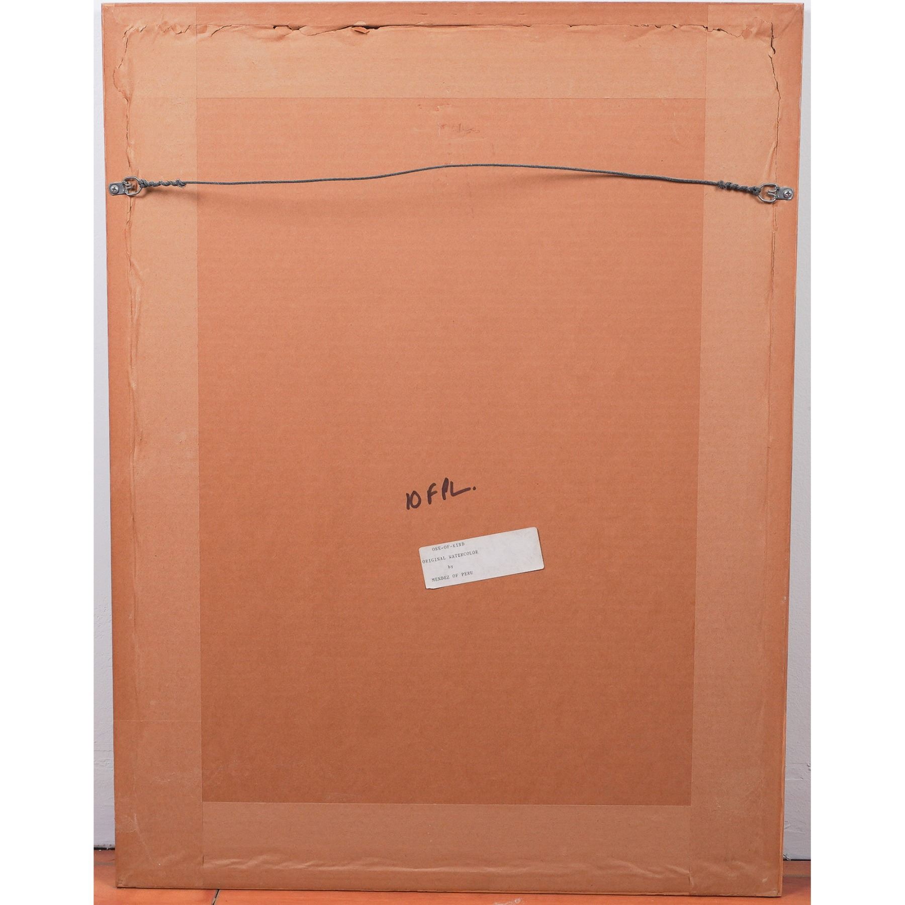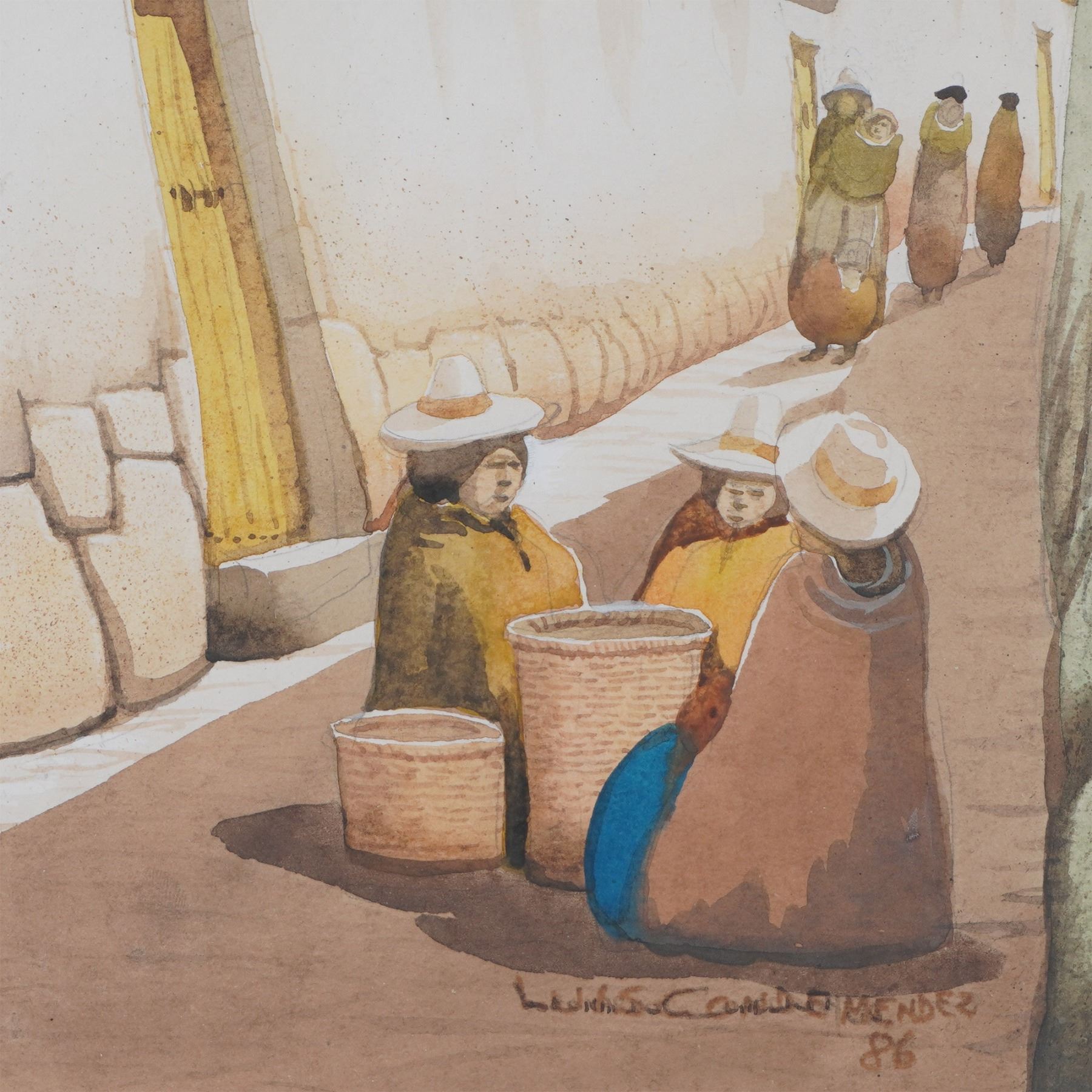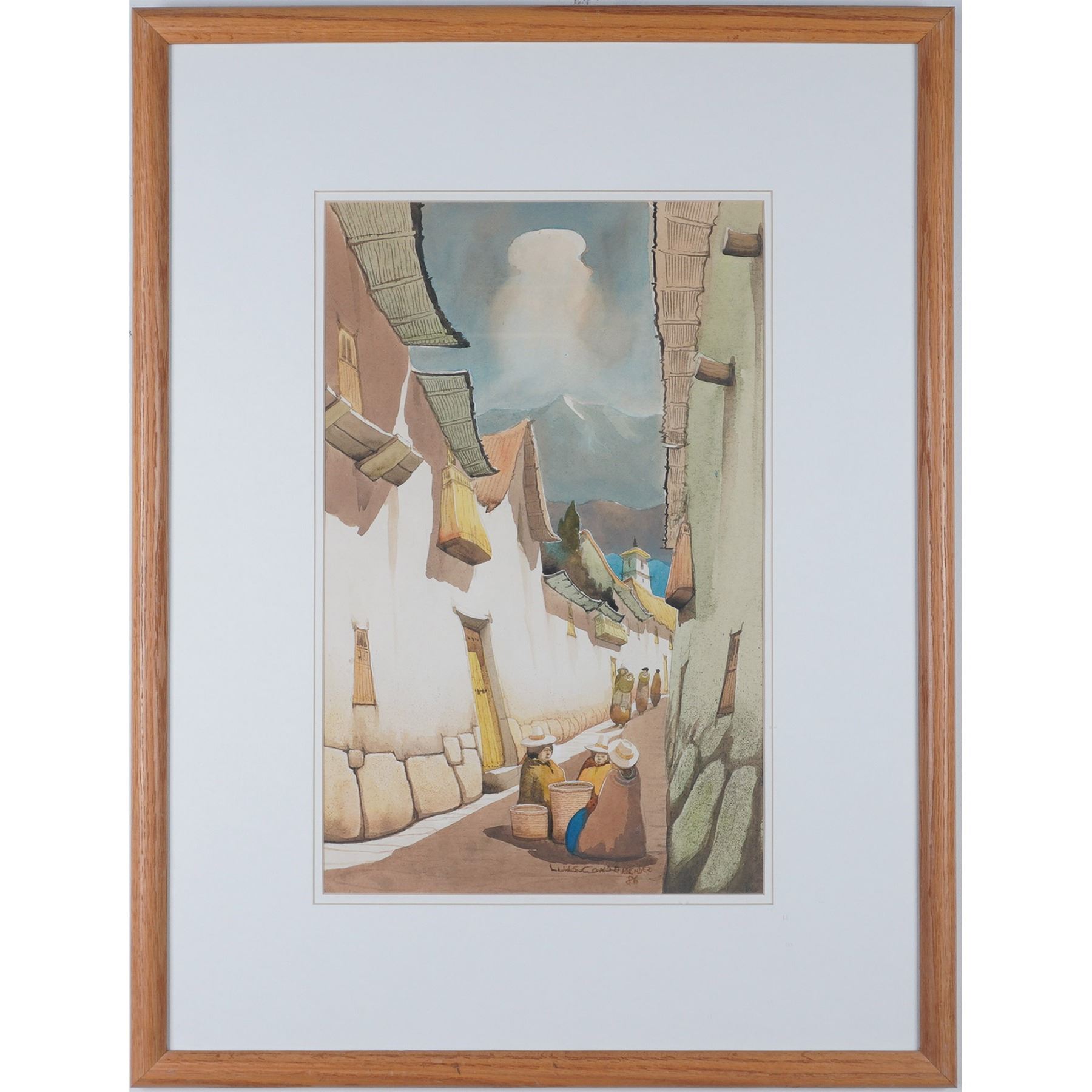 Original watercolor painting by Luis Mendez, depicting a traditional Andean street scene in Peru. The composition features white walled buildings with thatched roofs, a narrow cobblestone pathway, and villagers engaged in daily life. The artist captures the region's charm through vibrant colors, detailed brushwork, and an atmospheric perspective leading toward distant mountains beneath a dramatic sky. Executed in watercolor on paper, this work shows his mastery of light and texture, reflecting the architectural heritage and cultural richness of Peru. Framed, with the artist's signature and date inscribed in the lower right corner.