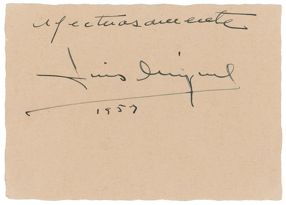 Famous bullfighter (1926-1996) who enjoyed wide popularity during the 1940s and 1950s as he conquered bulls all over Spain, Portugal, Colombia, and other places. In 1959, he and his brother-in-law, Antonio Ordóñez, engaged in a bullfighting rivalry that was chronicled by Ernest Hemingway in his book, The Dangerous Summer. Large vintage ink signature and sentiment on an off-white 5.75 x 4 card, dated 1957 by Dominguin. In fine condition.