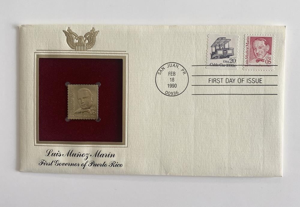 Luis Munoz Marin First Governor of Puerto Rico Gold Stamp Replica First Day Cover. San Juan, PR. Feb 15th 1990. 4x8 inches