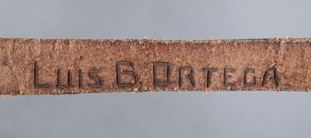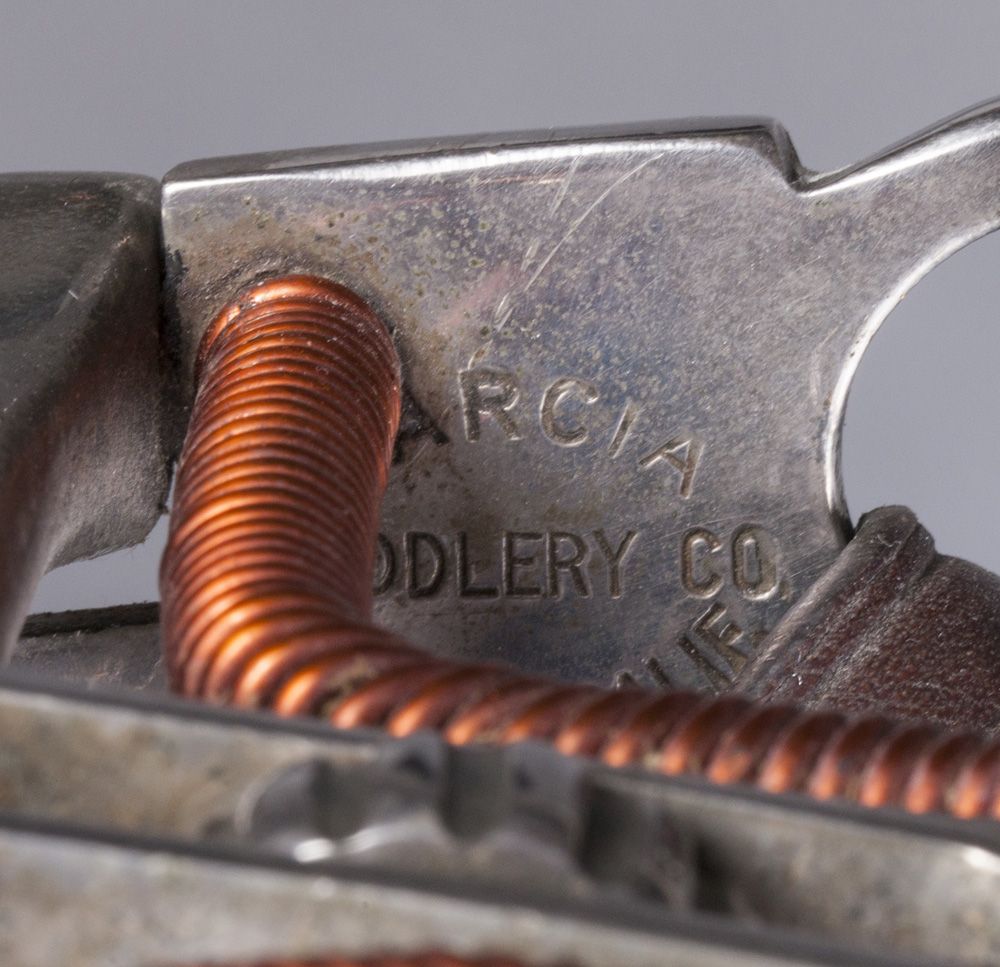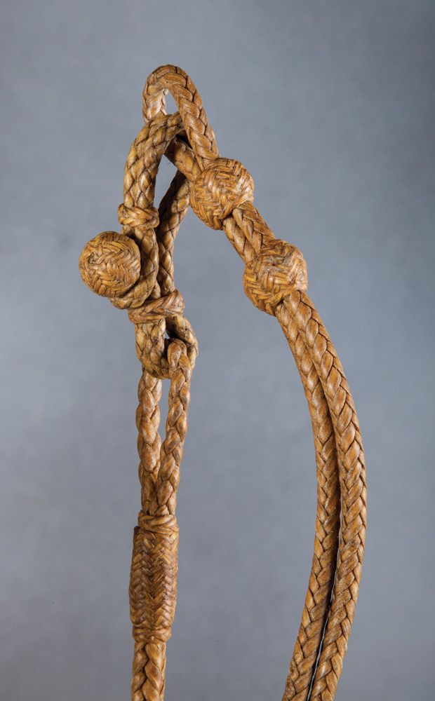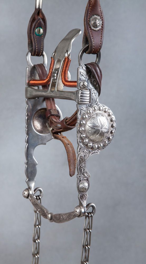 Luis Ortega Reins, Garcia Bit & Leather Headstall. Leather headstall with sterling silver conchos and ferrules affixed to an impressive lightly-used Garcia Saddlery Salinas, Calif., silver overlaid spade bit holding a pair of Luis B. Ortega finely braided closed rawhide reins adorned with buttons leading to a maker-marked Ortega popper. Excellent (very usable) condition.
