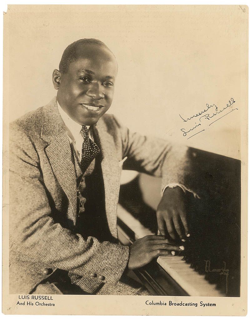 Vintage pearl-finish 8 x 10 Columbia Broadcasting System publicity photo of Russell at his piano, signed in fountain pen, “Sincerely, Luis Russell.” In very good condition, with light scattered creases, crazing to the emulsion in the upper part of the photo, tack holes to the corners, and light paper loss to the upper left corner.