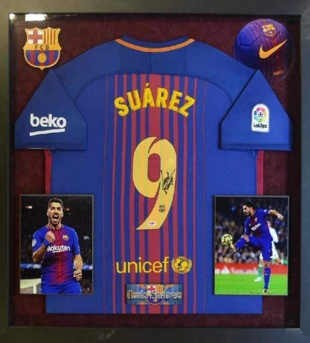 Custom framed Luis Suárez signed jersey and photo collage. Approximate dimensions are 24x30 inches. This item is authenticated by Beckett. .This item comes with a Certificate of Authenticity from a third party authenticator. This Certification of Authenticity does not imply that the item will be certified by any other rival authentication companies. The accompanied certification is the only certification the auction company can confirm. These items are being sold as collectable pieces and there is no guarantee that this item can be resold on any online marketplace. Each of these companies has their own policies and politics.