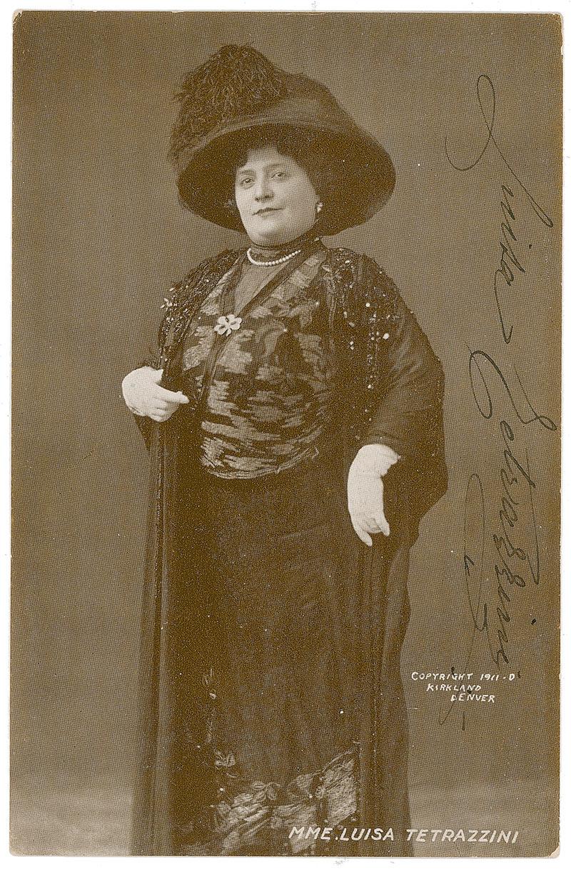 Immensely popular Italian operatic soprano (1871–1940) renowned for the acrobatic skill of her brilliant coloratura voice. The dish turkey Tetrazzini was named in her honor. Vintage 3.5 x 5.5 postcard photo, signed vertically in fountain pen. In fine condition.