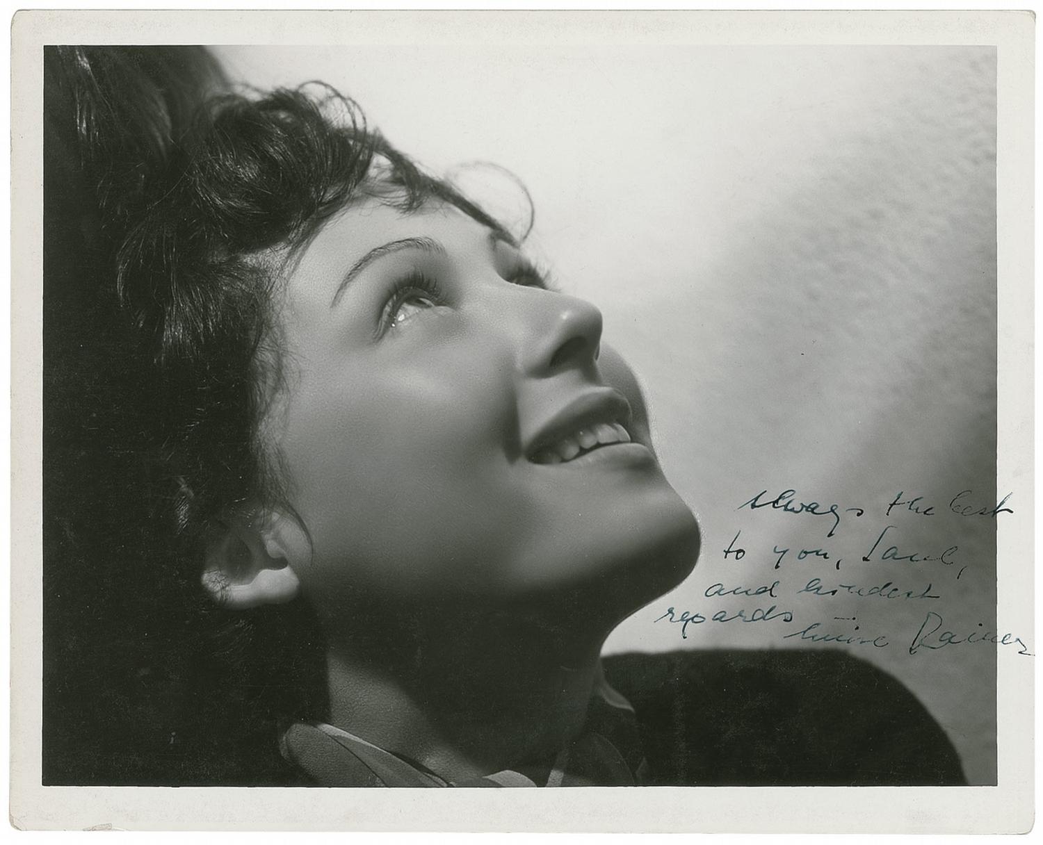 Vintage pearl-finish 10 x 8 double weight MGM Hurrell publicity photo, signed and inscribed in fountain pen “Always the best to you, Saul, and kindest regards—Luise Rainer.” Reverse of photo bears collector’s ink date notation of August 19, 1950, the date the signature was acquired. Reverse also bears an affixed caption touting Rainer “as the outstanding foreign discovery of years.” In fine condition, with small corner tip creases, light rubbing to surface, and a bit of irregular adhesion to signature and inscription. Saul Goodman Collection.