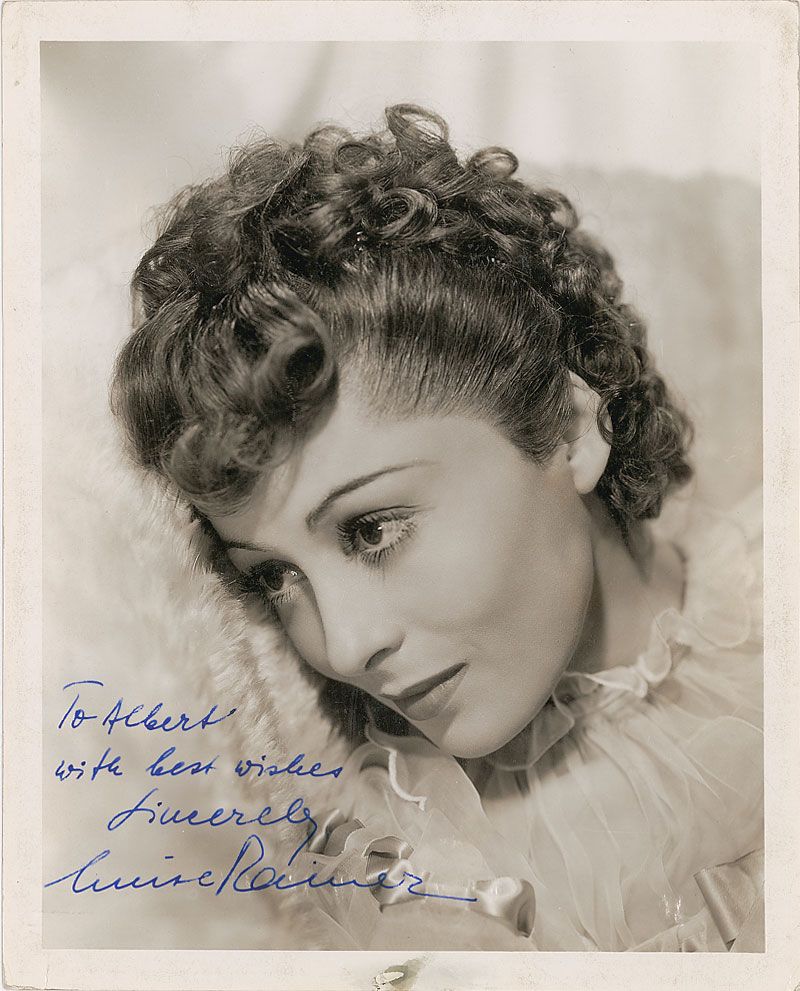 Vintage pearl-finish 8 x 10 MGM Clarence Sinclair Bull publicity photo for The Great Waltz, signed and inscribed in blue ink “To Albert, with best wishes, Sincerely, Luise Rainer.” Some scattered light soiling and surface loss to borders, mild rubbing, a bit of light silvering to darker areas, and a bit of irregular ink adhesion to signature and inscription, otherwise fine condition.