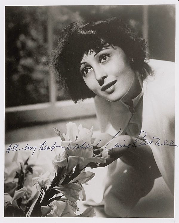 Glossy 8 x 10 photo of the actress smelling a flower, signed in black felt tip, “All my best wishes, Luise Rainer.” In fine condition.