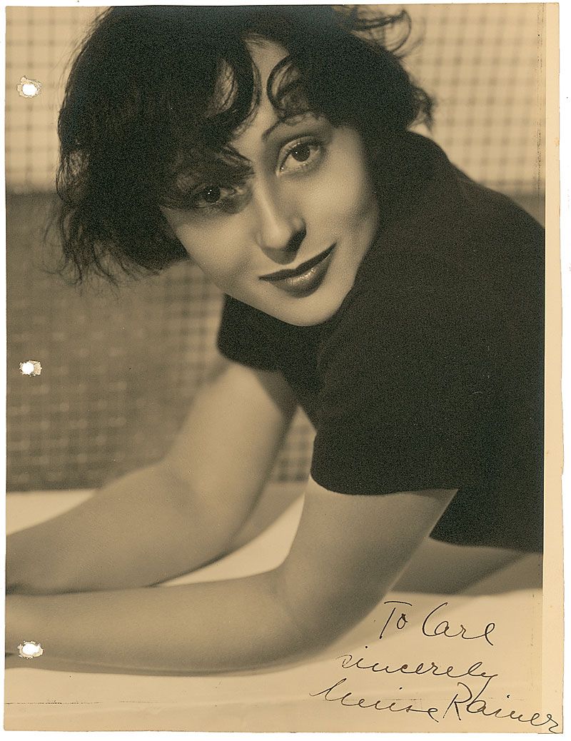 Vintage matte-finish 8.25 x 11 photo of Rainer lying down and resting on her elbows, signed and inscribed in fountain pen, “To Carl, Sincerely, Luise Rainer.” In very good condition, with three punch holes to the left border and irregularly trimmed edges.