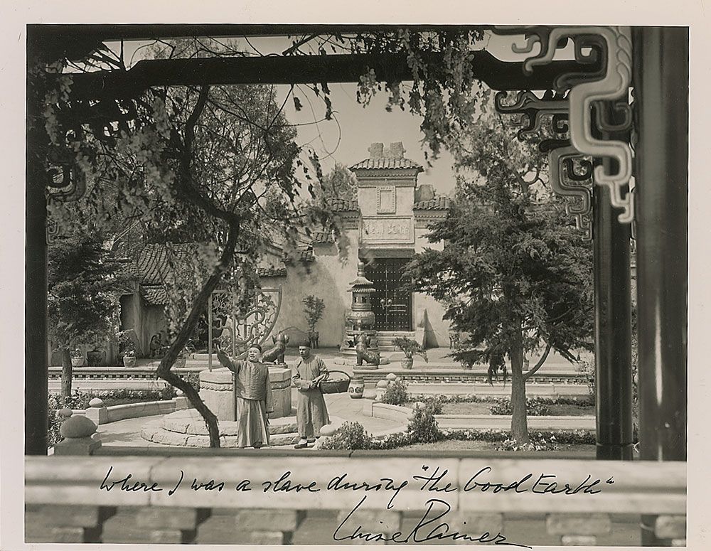 Glossy 10 x 7.75 press photo photo of the set from the film based on Pearl Buck’s Pulitzer Prize–winning novel, signed in black ink, “Where I was a slave during ‘The Good Earth,’ Luise Rainer.” Reverse of photo bears an affixed caption. In fine condition, with a few unobtrusive cracks to emulsion and slightly trimmed lower edge.