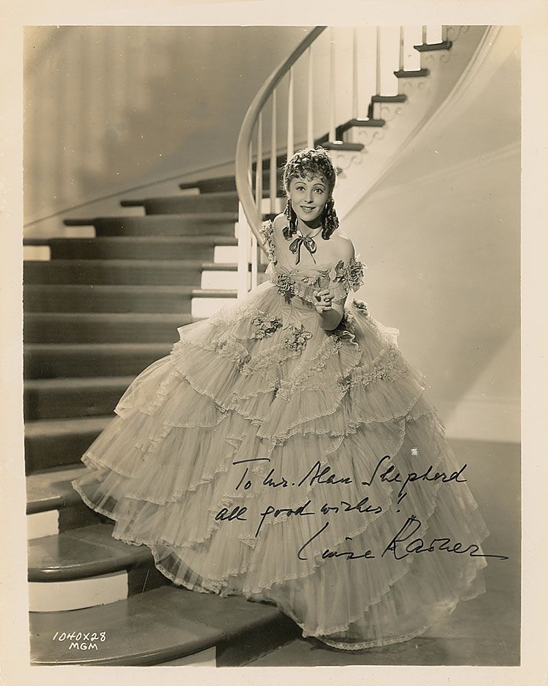 Glossy 8 x 10 full-length photo of Rainer descending a staircase, signed and inscribed in black ink, “To Mr. Alan Shepherd, all good wishes! Luise Rainer.” In fine condition, with creases to corners .