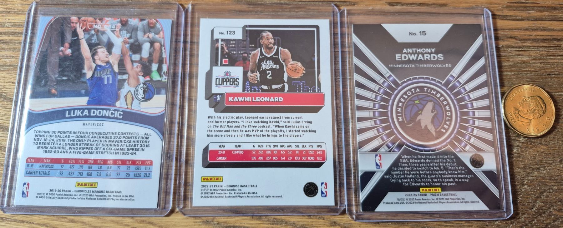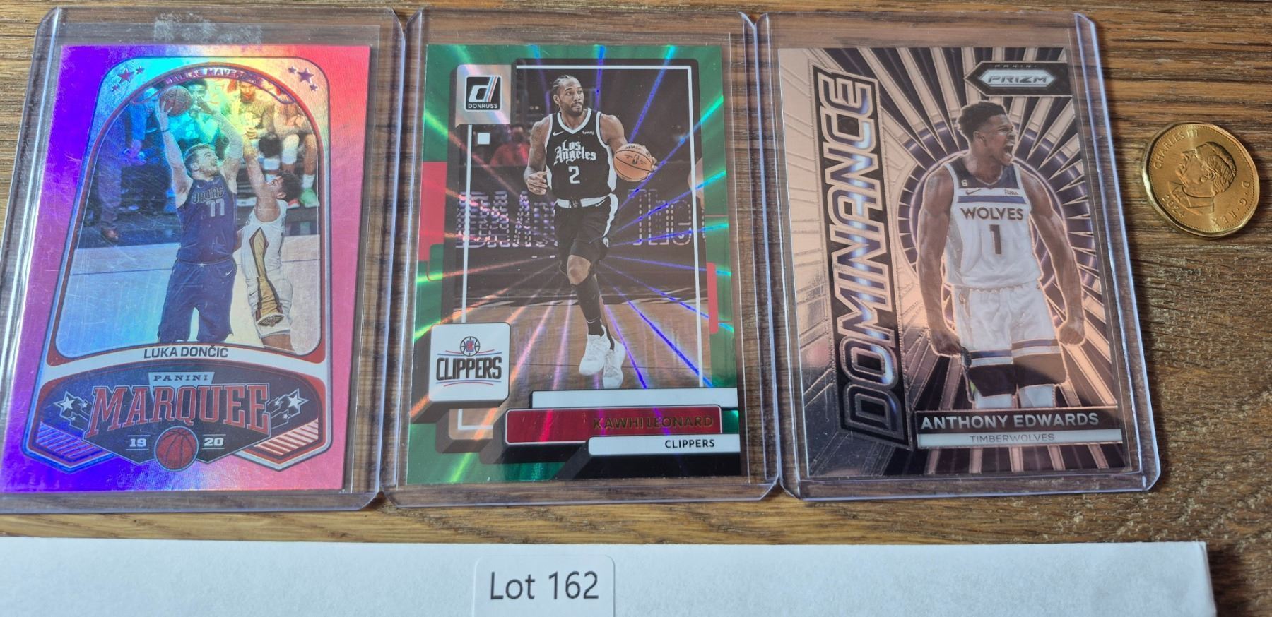 Luka Dončić 2019-20 Chronicles Marquee Pink, Kawhi Leonard 2022-23 Donruss Green Laser, Anthony Edwards 2023-24 Prizm Dominance Silver.
