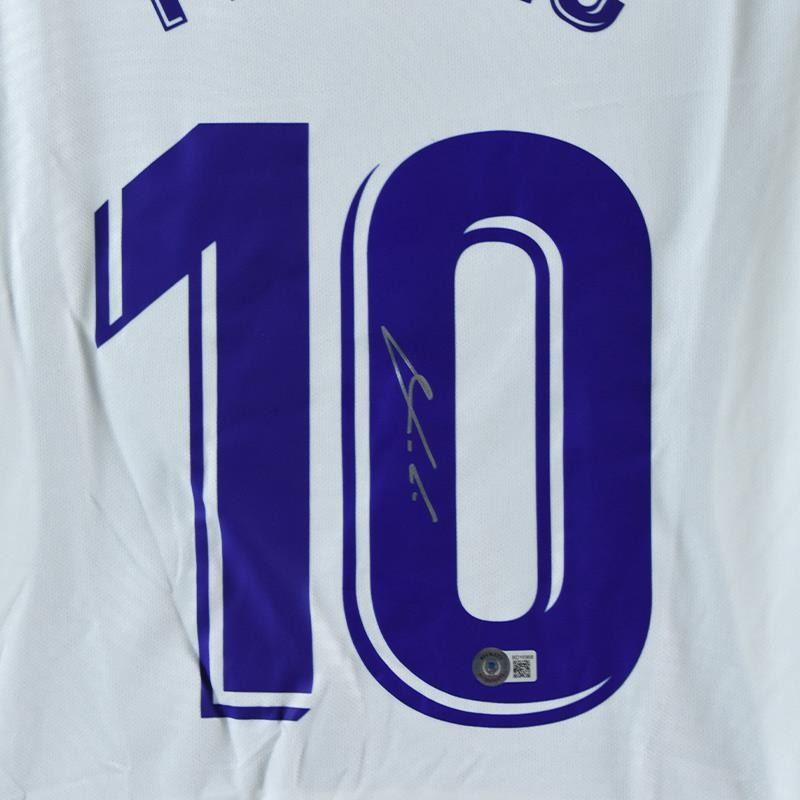 This is a replica Real Madrid soccer jersey autographed by Luka Modric. This piece is presented with a Certificate of Authenticity from Beckett with a QR code and certification number. Measures approx. 30" x 28" (jersey).
