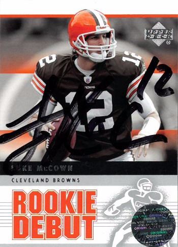 Luke McCown was drafted by the Cleveland Browns in the fourth round of the 2004 NFL Draft. He went on to start in four games for Cleveland. Luke McCown has hand signed this 2005 Upper Deck Rookie Debut Trading Card #12. Certificate of Authenticity from Athlon Sports Collectibles.