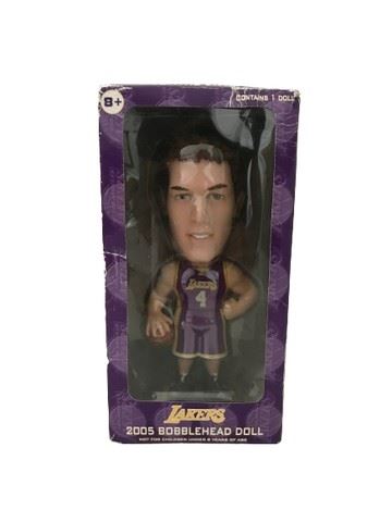 Luke Walton in his Los Angeles Lakers uniform bobblehead. This was a promotional bobblehead made by Forever Collectibles in partnership with Carl's Jr. in 2005. It depicts Walton in his Lakers uniform from that season, which was his second stint with the team. The bobblehead is made of ceramic and stands about 7 inches tall.
