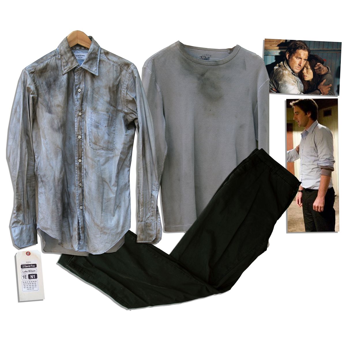 Luke Wilson screen-worn ''hero'' wardrobe from the chilling horror movie ''Vacancy.'' Wilson stars with Kate Beckinsale as a young couple who must escape a hellish motel or become victims of their own horror movie. This purposely stained and heavily soiled outfit is worn by Wilson in multiple scenes after he crawls through a dirty tunnel trying to escape his room. Lot includes a light blue Thom Browne long sleeve shirt (with ''Hero'' on the inside tag), a grey long sleeve J. Crew thermal shirt (also with ''Hero'' written inside), and a pair of black Viktor & Rolf ''Monsieur'' flat front pants (with slight split in the back near belt loop). With a wardrobe department tag that lists Luke Wilson, character name, movie title and multiple scene numbers. Heavy soiling on shirt and thermal from use on set, else very good. With a COA from Premiere Props.