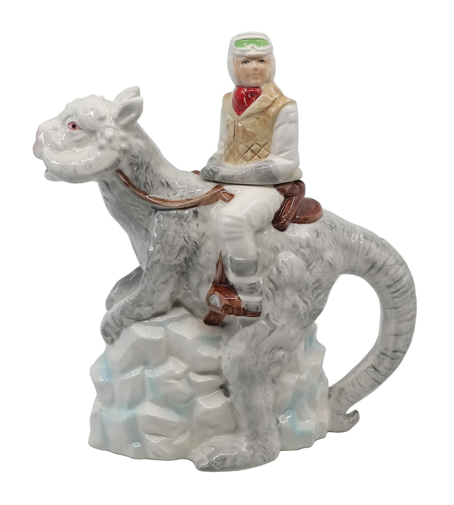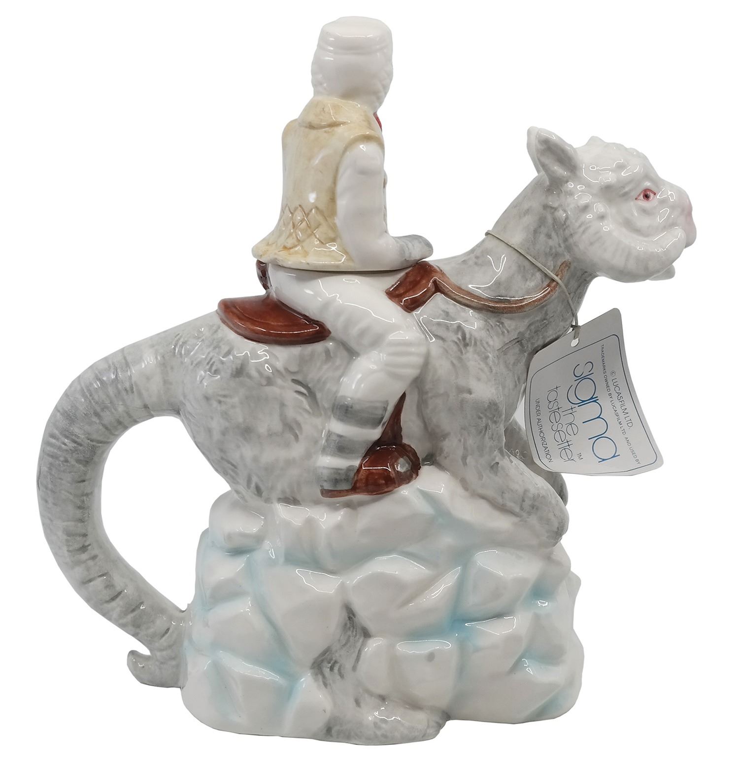 (Sigma, 1983) A ceramic teapot created by Sigma that depicts Luke Skywalker riding a Tauntaun. Luke's upper-body removes so the pot can be filled, and the liquid pours from the Tauntaun's mouth. This hand-painted teapot measures 10" tall and is in very good unused condition. The original box and tag are included, both of which have some creasing and wear throughout.