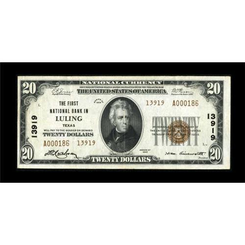 <B>Luling, TX</B></I> - $20 1929 Ty. 2 <B>The First NB</B></I> Ch. # 13919<BR> Pleasing <B>Very Fine+</B></I> with D.B. Cochran as cashier and H.M. Ainsworth as president.<BR><BR><b>Shipping:</b> Coins & Currency (<a target="_blank" href="http://www.heritageauctions.com/common/shipping.php">view shipping information</a>)