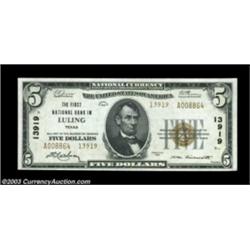 <TABLE cellSpacing=0 cellPadding=0 width="100%" bgColor=#000000 border=0><TBODY> <TR><TD width="100%"><TABLE cellSpacing=1 cellPadding=3 width="100%" border=0><TBODY><TR><TD width="100%" bgColor=#79735c><FONT face=arial color=#ffffff size=3><B>Description</B> </FONT></TD></TR><TR><TD width="100%" bgColor=#ffffff><FONT face=arial size=2><B>Luling, TX</B></I> - $5 1929 Ty. 2 <B>The First NB</B></I> Ch. # 13919<BR>A small group of high grade notes has provided collectors with a few beauties from this town. This Type 2 Five is boldly embossed and would be a Gem but for the centering. <B>Choice Crisp Uncirculated.</B></I> (700-1,000 ) </FONT></TD></TR></TBODY></TABLE></TD></TR></TBODY></TABLE><BR><TABLE cellSpacing=0 cellPadding=0 width="100%" bgColor=#000000 border=0><TBODY><TR> Important notice: Heritage usually auctions material at the rate of 200-250 lots per hour. On some occasions eBay Live bid software or the Internet may not be able to keep up with the pace of the auction. We recommend placing a realistic absentee bid now as insurance to avoid disappointment. Occasionally the auctioneer may eliminate or reject an eBay Live bid, and the auctioneer may also reopen a lot after the close of the eBay live bidding (usually because we missed an audience bid), and may reject your bid even if it shows you as the winning bidder. By bidding via eBay Live, you agree that Heritage may award the lot to another bidder at its sole discretion under the circumstances described above or any other reasonable circumstances. Also please note that all Heritage lots purchased through eBay Live carry a 20% Buyer's Premium. Please make sure you read the Terms and Conditions before you bid.</TR></TBODY></TABLE>