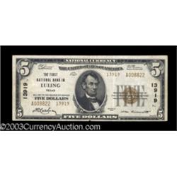 <TABLE cellSpacing=0 cellPadding=0 width="100%" bgColor=#000000 border=0><TBODY> <TR><TD width="100%"><TABLE cellSpacing=1 cellPadding=3 width="100%" border=0><TBODY><TR><TD width="100%" bgColor=#79735c><FONT face=arial color=#ffffff size=3><B>Description</B> </FONT></TD></TR><TR><TD width="100%" bgColor=#ffffff><FONT face=arial size=2><B>Luling, TX</B></I> - $5 1929 Ty. 2 <B>The First NB</B></I> Ch. # 13919<BR>This Type 2 Five picked up a few hard storage folds. <B>Very Fine.</B></I> (350-550 ) </FONT></TD></TR></TBODY></TABLE></TD></TR></TBODY></TABLE><BR><TABLE cellSpacing=0 cellPadding=0 width="100%" bgColor=#000000 border=0><TBODY><TR> Important notice: Heritage usually auctions material at the rate of 200-250 lots per hour. On some occasions eBay Live bid software or the Internet may not be able to keep up with the pace of the auction. We recommend placing a realistic absentee bid now as insurance to avoid disappointment. Occasionally the auctioneer may eliminate or reject an eBay Live bid, and the auctioneer may also reopen a lot after the close of the eBay live bidding (usually because we missed an audience bid), and may reject your bid even if it shows you as the winning bidder. By bidding via eBay Live, you agree that Heritage may award the lot to another bidder at its sole discretion under the circumstances described above or any other reasonable circumstances. Also please note that all Heritage lots purchased through eBay Live carry a 20% Buyer's Premium. Please make sure you read the Terms and Conditions before you bid.</TR></TBODY></TABLE>