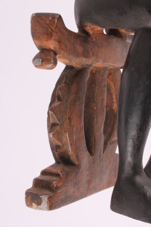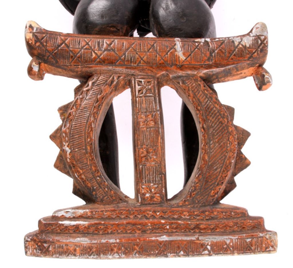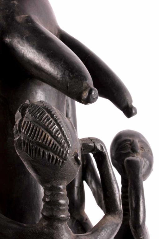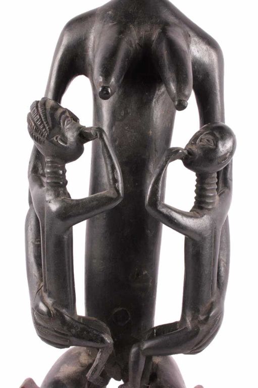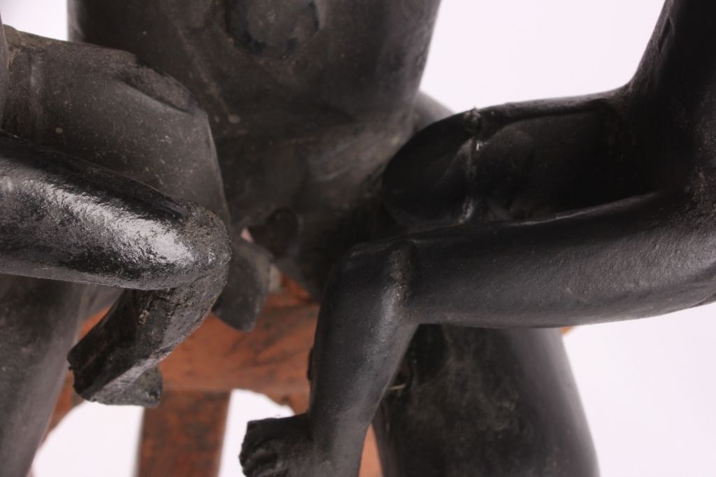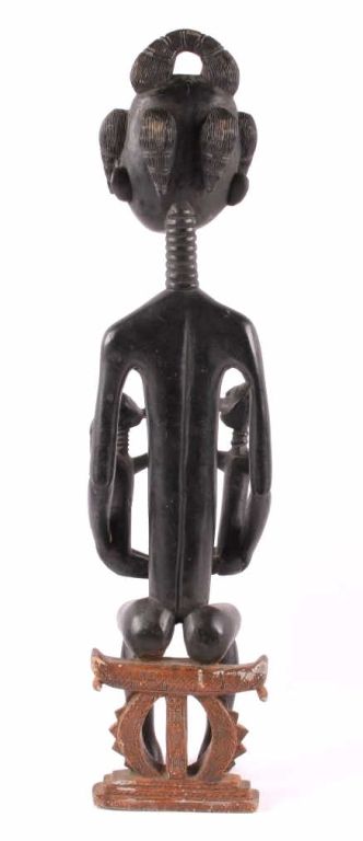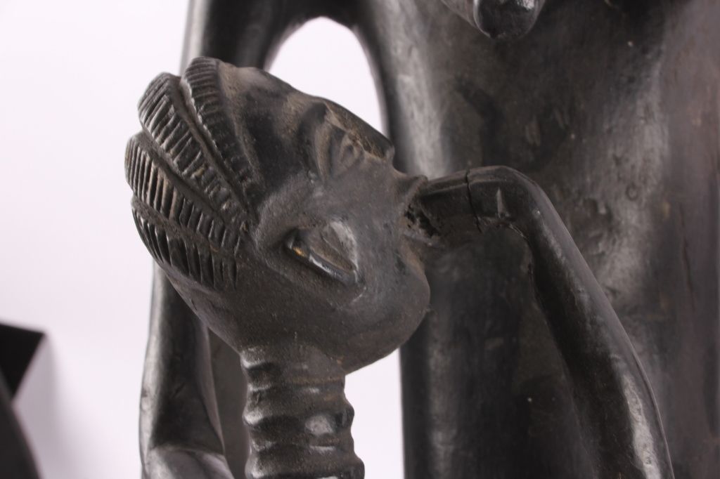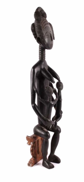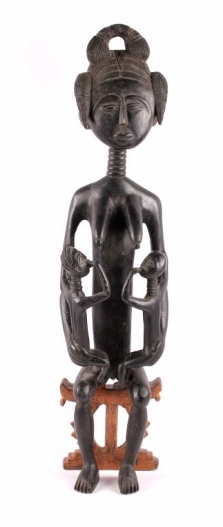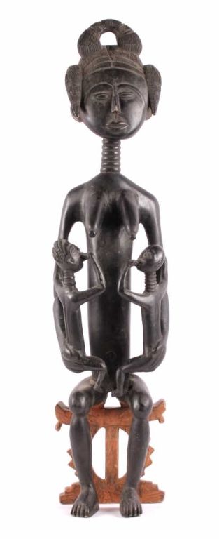 This is a hand carved solid wood statue from the Lulua Tribal people of the Democratic Republic of the Congo. The Lulua, also known as the Bena Lulua settled in the southern part of DRC after migrating there fromwestern African during the 18th century. Lulua sculpture is elegant and graceful, with complex scarification on the neck, abdomen, face and limbs, which recalls old Lulua customs, now long gone due to scarificationuse being banned in 1888. This scultpure shows a mother breast feeding her two children. This has a few repaired areas, but shows excellent carvings and is a very rare piece. The piece is believed to haveconsiderable age being from the 19th to 20th century. Measures 35.25" tall and 8.5"x7"
