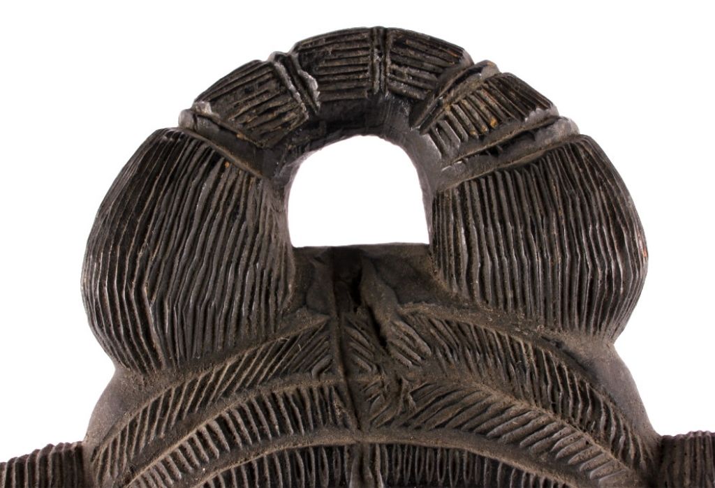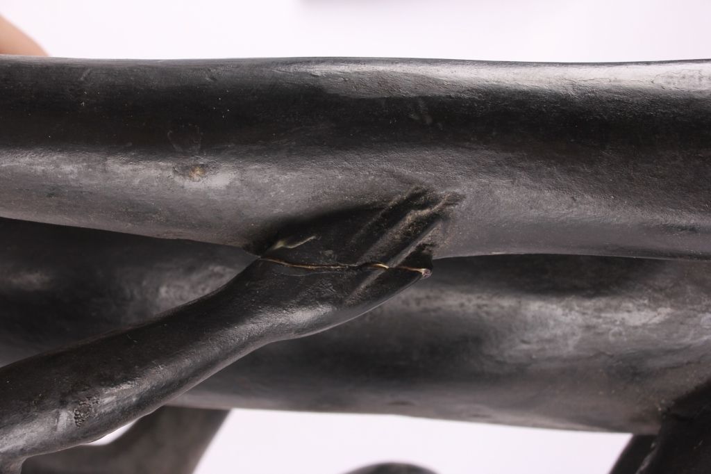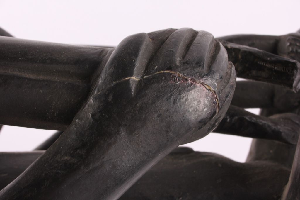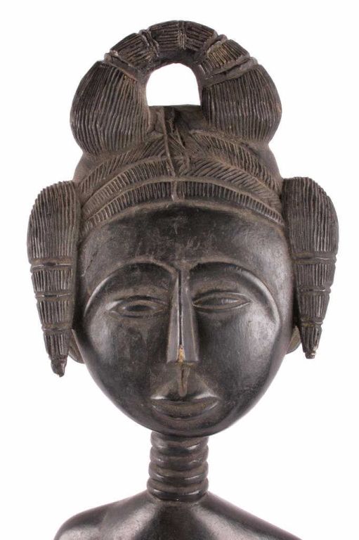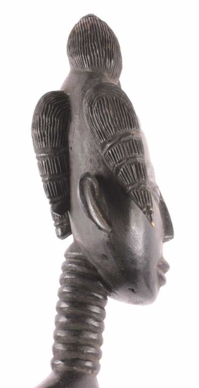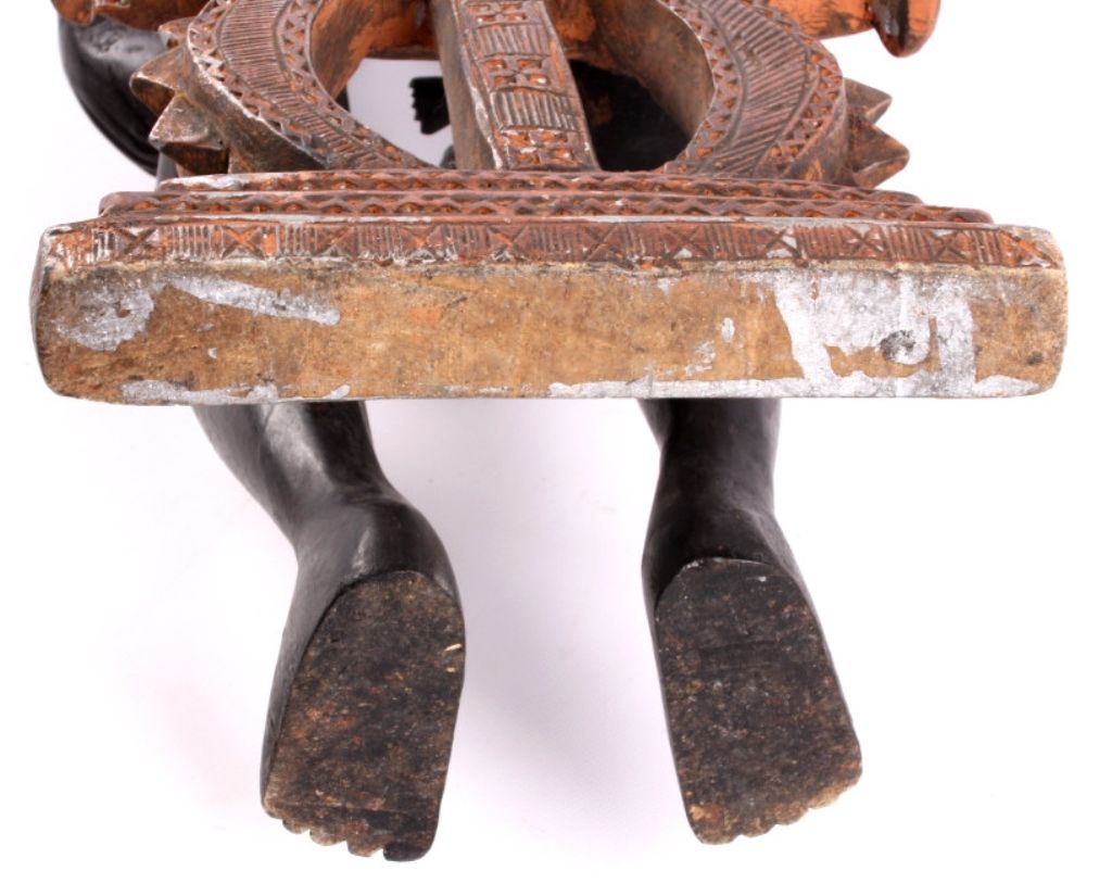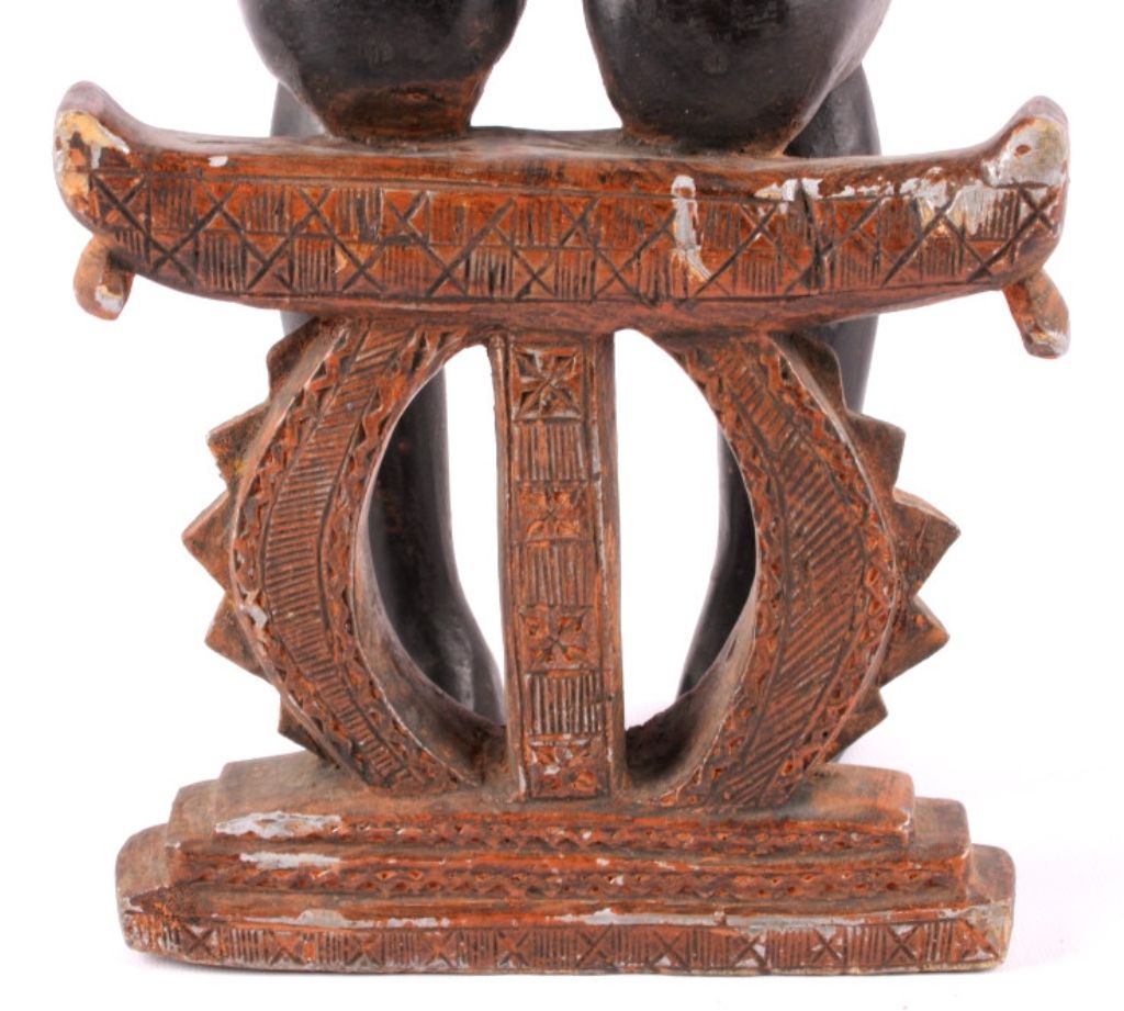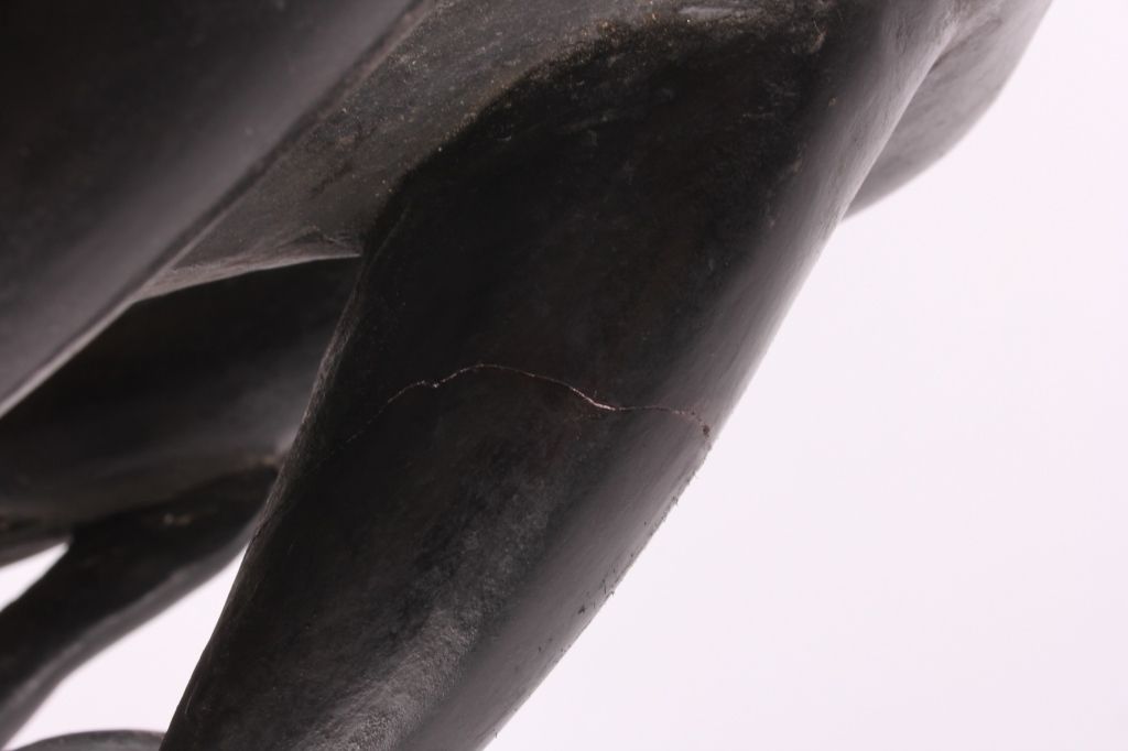 This is a hand carved solid wood statue from the Lulua Tribal people of the Democratic Republic of the Congo. The Lulua, also known as the Bena Lulua settled in the southern part of DRC after migrating there fromwestern African during the 18th century. Lulua sculpture is elegant and graceful, with complex scarification on the neck, abdomen, face and limbs, which recalls old Lulua customs, now long gone due to scarificationuse being banned in 1888. This scultpure shows a mother breast feeding her two children. This has a few repaired areas, but shows excellent carvings and is a very rare piece. The piece is believed to haveconsiderable age being from the 19th to 20th century. Measures 35.25" tall and 8.5"x7"