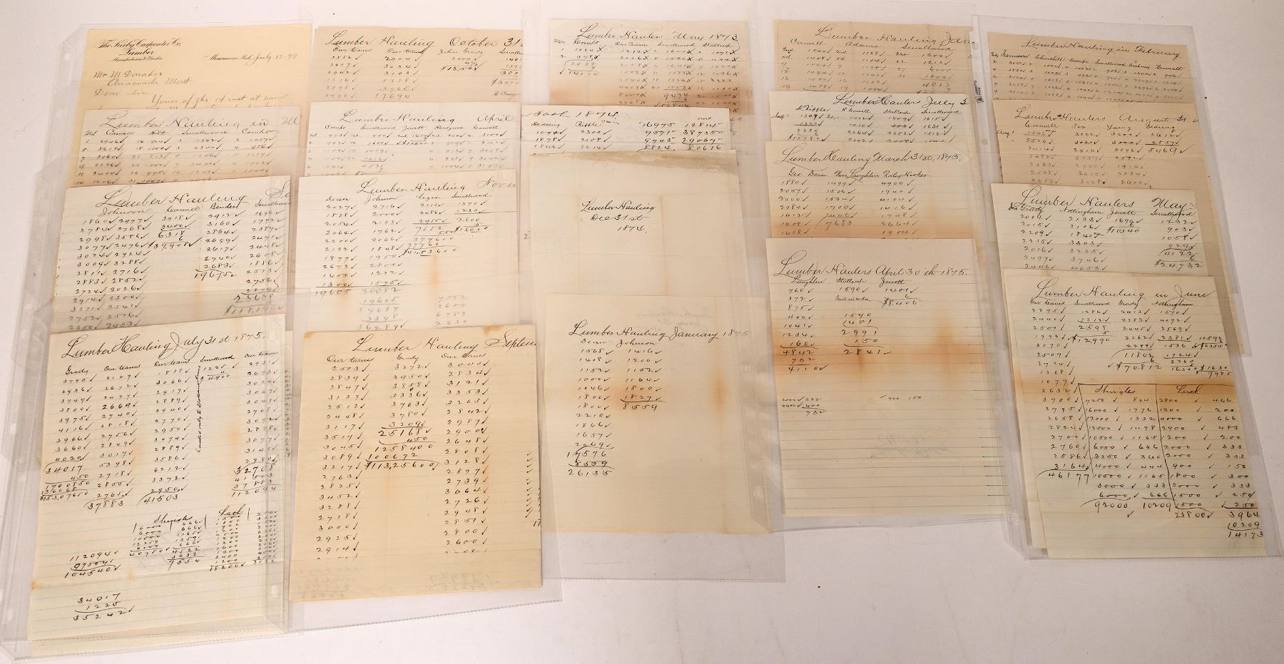 Group of pages that were originally from a ledger of a lumber hauling company. These pages show statistics for the company by month between 1873 and 1875. There is also a piece of correspondence from the Kirby Carpenter Co. from July 1899. This letter is addressed to Mr. M. Donahue in Anaconda, Montana. This letter and the ledger pages may or may not be from the same company. The ledger pages are 15.5 x 9.75 and the letter is 8.25 x 10.75, all good condition.